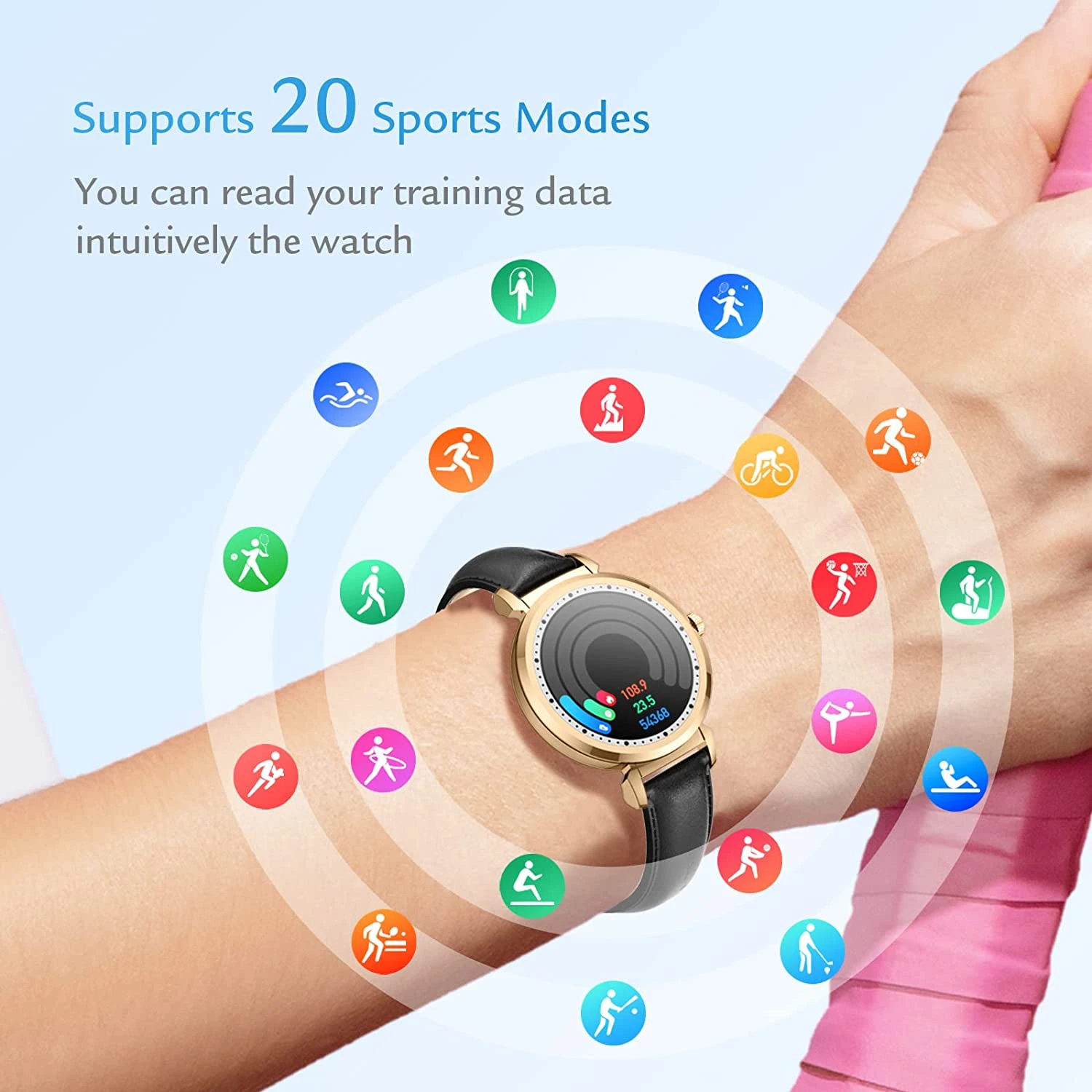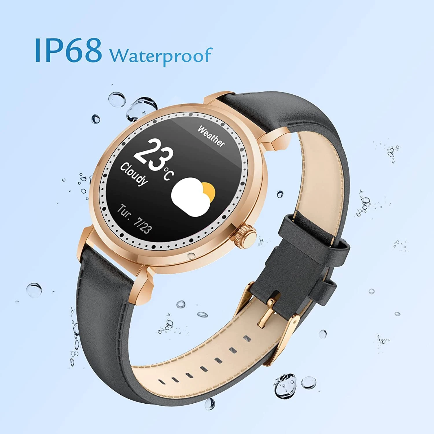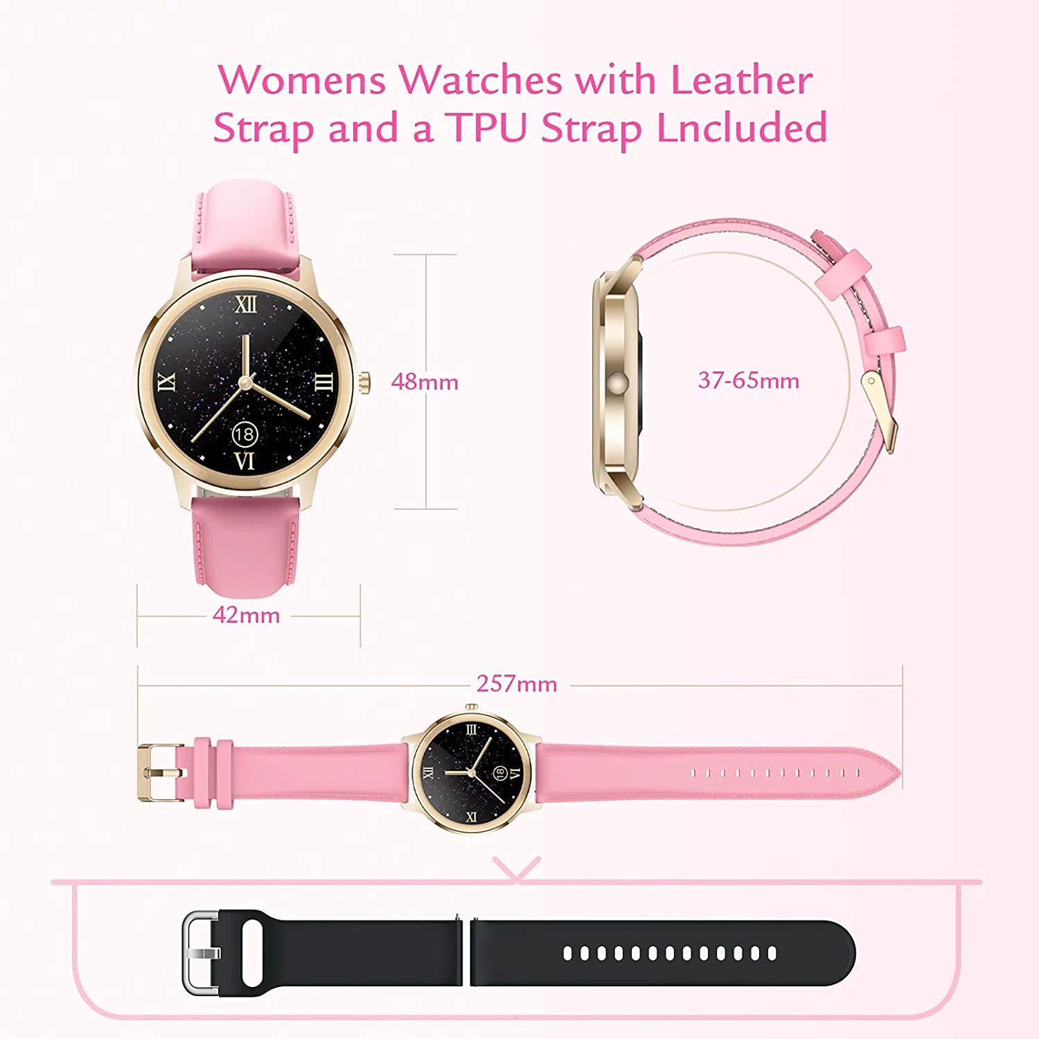 Notre montre intelligente pour femmes dispose d’un bracelet en cuir (noir ou rose) afin de vous accompagner durant vos sorties occasionnelles ou sur votre lieu de travail. Elle a un deuxième bracelet offert en TPU plus confortable et adapté aux activités sportives ❤️.