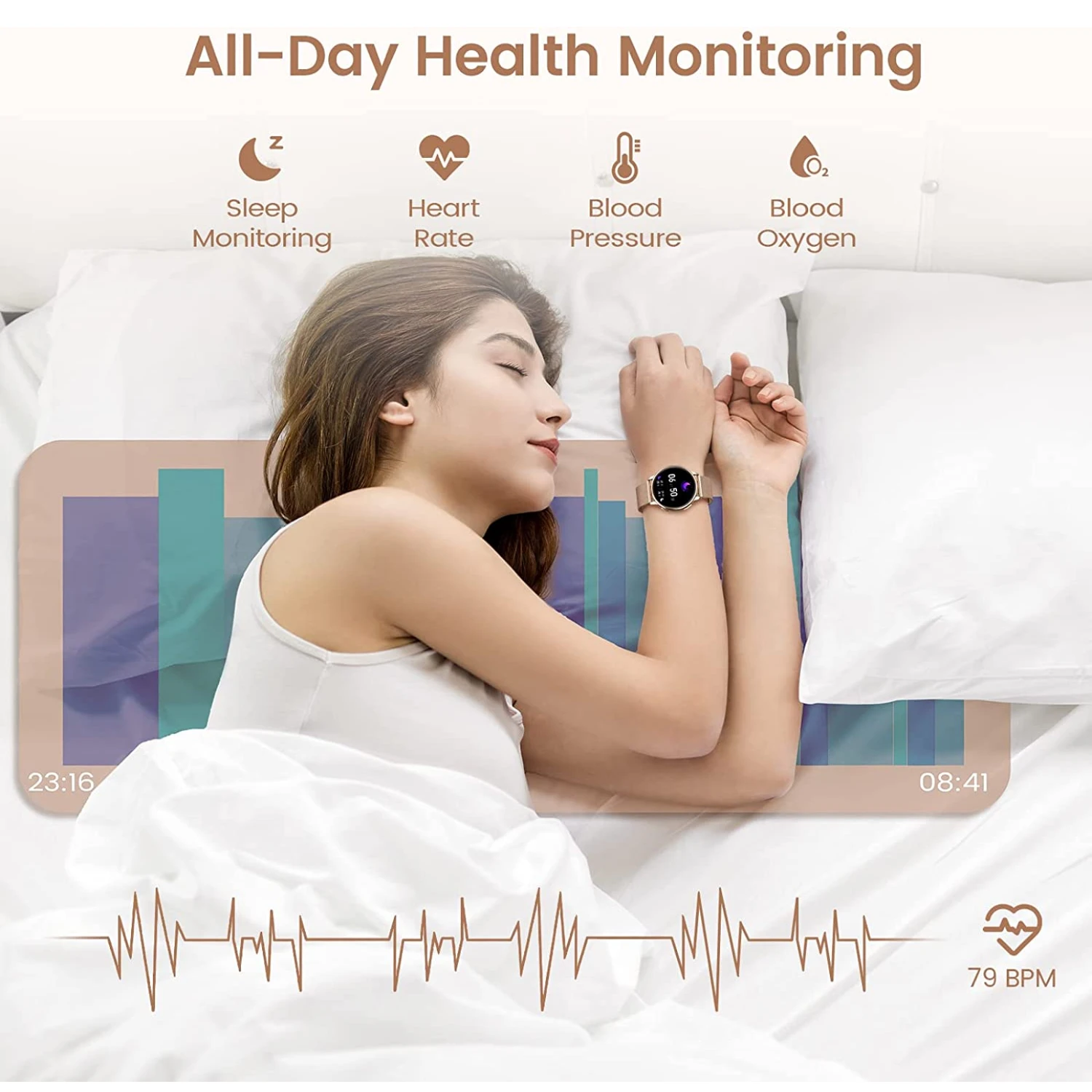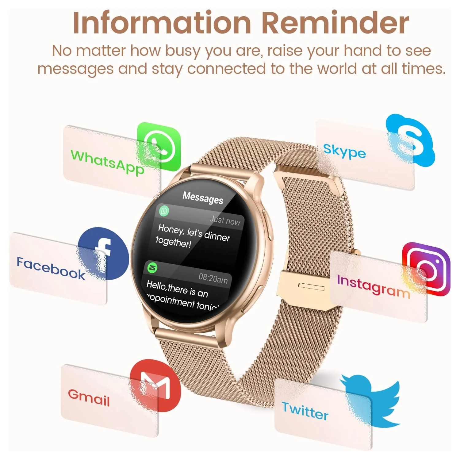 Notre montre intelligente pour femmes a un style moderne. Un microphone et un haut-parleur sont intégrés permettant de passer des appels. Elle permet de donner l’heure, mais également de recevoir les notifications de son téléphone portable ❤️.