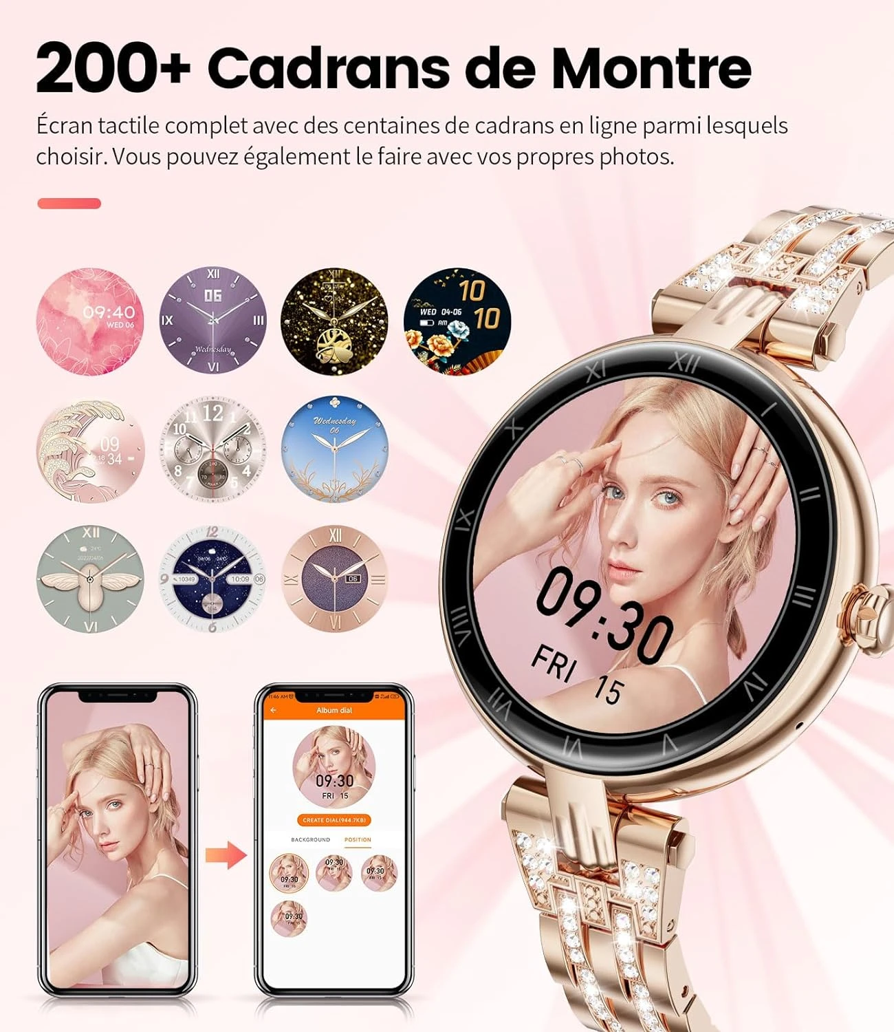 💎 Design Élégant avec Diamants et 200+ Cadrans Personnalisables : Dotée d’un écran AMOLED de 1,16 pouce, notre montre est ornée de diamants délicats pour une touche de luxe. Elle est livrée avec deux bracelets de haute qualité : l’un en métal résistant avec des diamants et l’autre en silicone souple. Choisissez parmi plus de 200 cadrans personnalisables ou téléchargez vos images préférées pour un cadran unique.