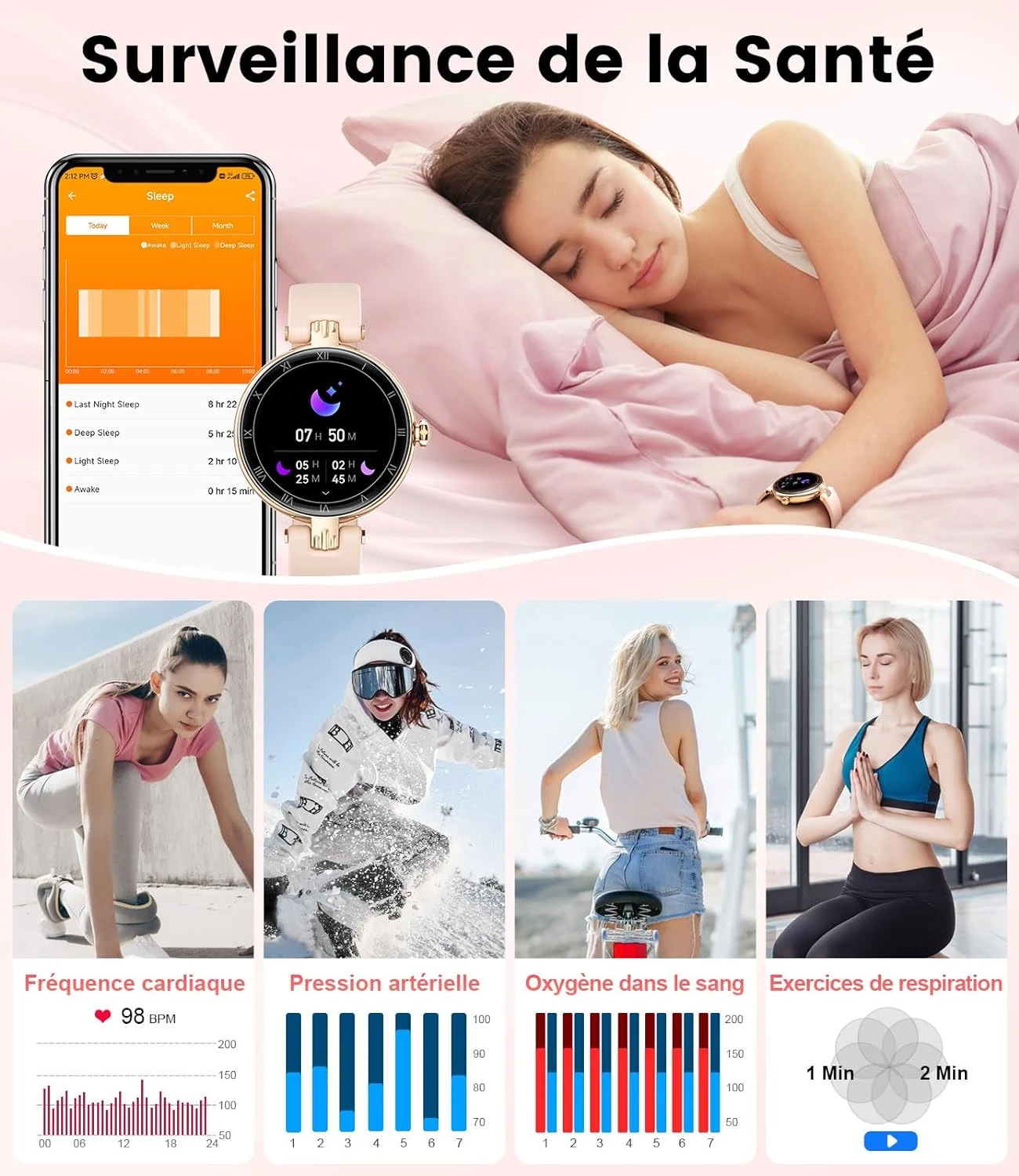 💗 Suivi de la Santé Féminine 24 Heures sur 24 : Surveillez en continu votre fréquence cardiaque, respiration, pression artérielle, saturation en oxygène et qualité du sommeil. Enregistrez avec précision votre cycle menstruel et vos jours d’ovulation. Que vous cherchiez à concevoir ou à suivre votre cycle, cette montre vous offre la tranquillité d’esprit nécessaire.