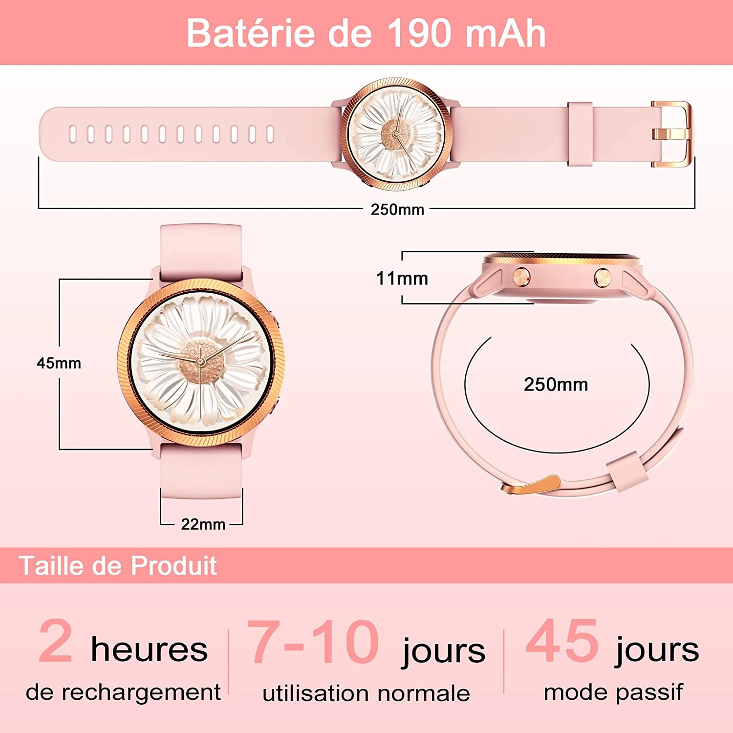 Notre montre intelligente pour femmes a un écran de forme ronde haute définition, petit, mignon et offrant une expérience visuelle remarquable ❤️. Sa capacité de 190 mAh offre une grande autonomie de 7 à 10 jours en moyenne et elle permet de suivre sa santé féminine et bien plus. Une équipe est mise à votre disposition via notre onglet contact afin de répondre sous 24 heures à chacune de vos questions / demandes ✅.