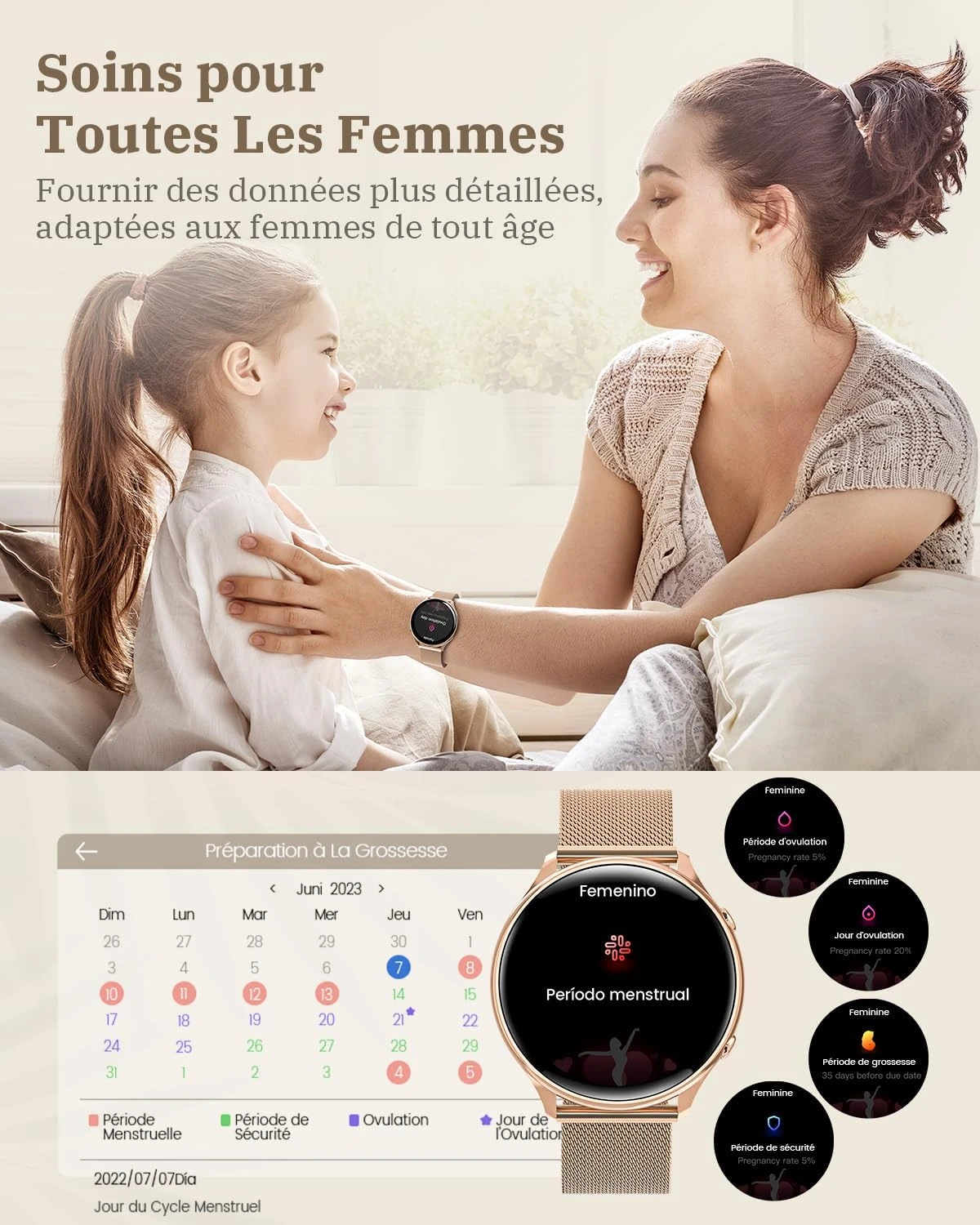 💗 24/7 Protégez votre santé : Avec des fonctionnalités spécialement conçues pour les femmes, notre montre connectée prend en charge la prévision des menstruations, surveille le cycle de grossesse et suit les signes de la ménopause. Elle surveille également votre fréquence cardiaque, la Spo2, la tension artérielle et l’état du sommeil, faisant de cette montre un cadeau idéal pour les femmes de tous âges.