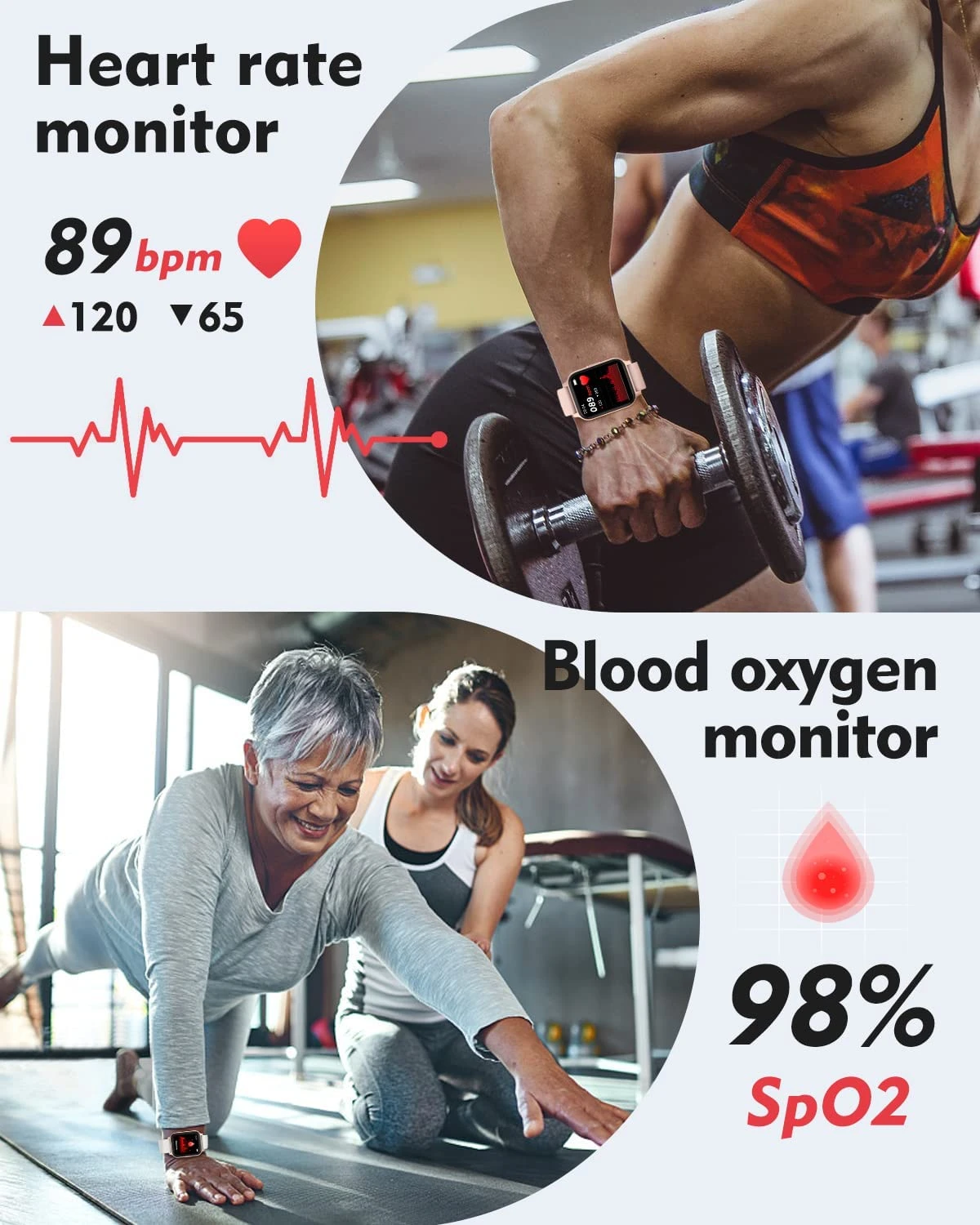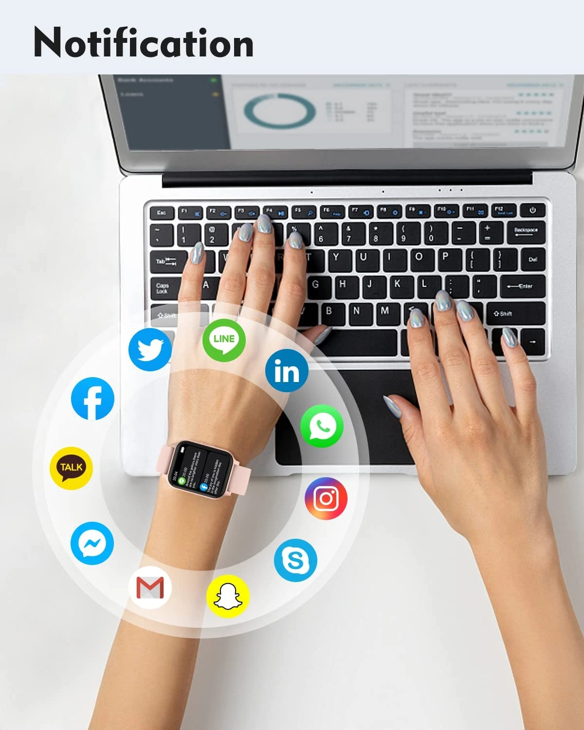 Notre montre connectée pour femmes a un grand écran tactile AMOLED d’une taille de 1,69 pouce affichant de belles couleurs et une luminosité élevée. Complète, elle permet de suivre le nombre de calories dépensées, le nombre de pas effectuée dans la journée et autres ❤️.