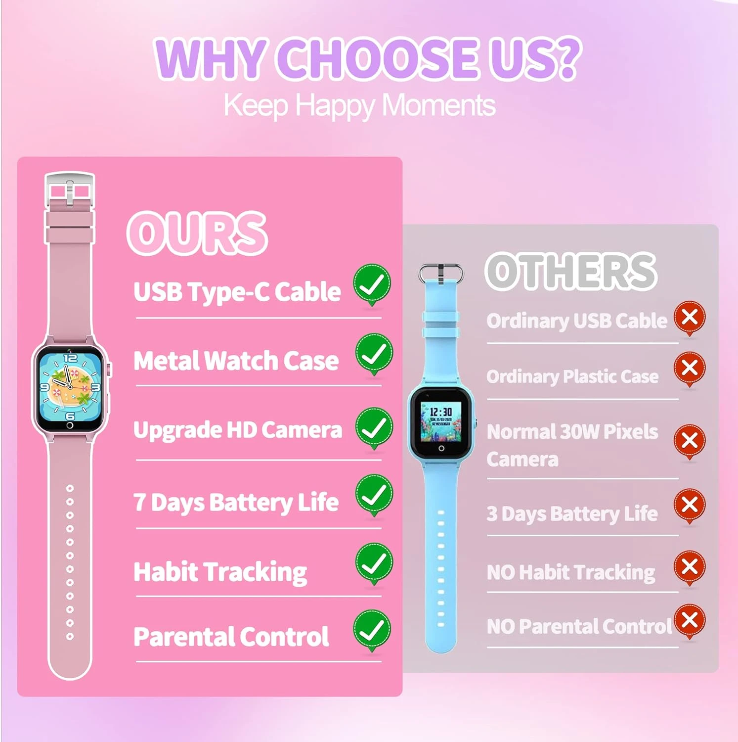 Équipée d’une caméra HD de 300 000 pixels et d’une résolution de 240*280, notre montre offre des photos et vidéos d’une clarté exceptionnelle, bien supérieure aux montres pour enfants ordinaires. De plus, cinq autocollants amusants sont intégrés pour des prises de vue ludiques en famille ou entre amis.