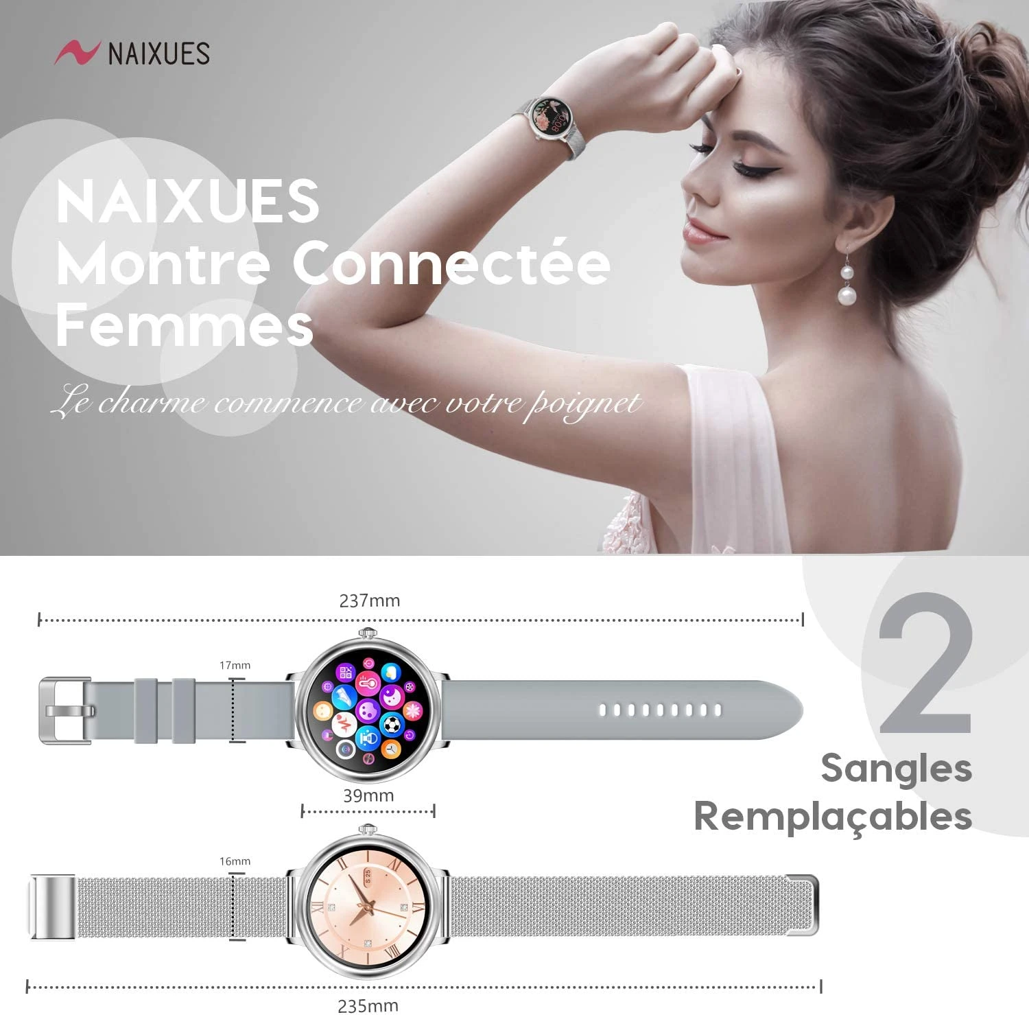 | Bracelets : 2 remplaçables (acier et silicone) | |