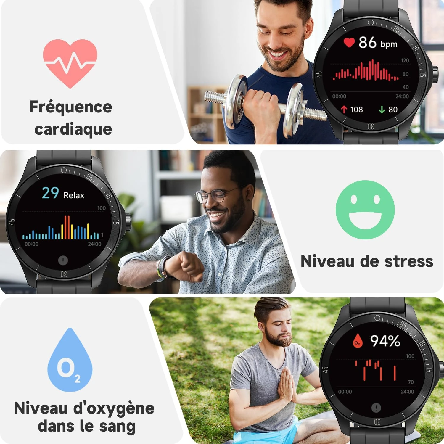 Tracker d’activité et de fitness 💪 Surveillez votre santé en temps réel avec le tracker d’activité. Mesurez votre fréquence cardiaque, taux d’oxygène dans le sang, niveau de stress, et choisissez parmi 100 modes sportifs différents. Suivez vos pas, les calories brûlées, et profitez de l’étanchéité IP68, parfaite même pour la natation.