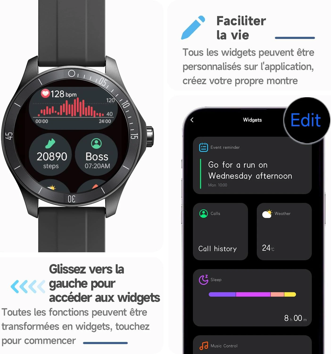 Reste connecté en déplacement 📱 Simplifiez votre quotidien en gérant appels et messages à un seul endroit. Grâce à la compatibilité Bluetooth, notre montre connectée vous permet de passer et recevoir des appels téléphoniques, tout en recevant les notifications des réseaux sociaux, des e-mails, et des SMS directement sur votre poignet.