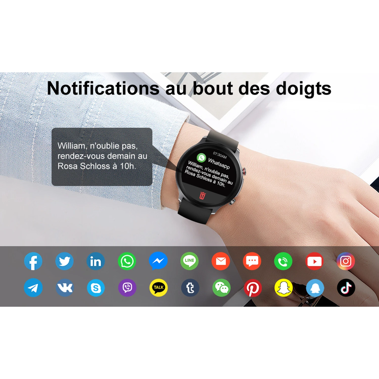 Elle affiche les notifications (messages et appels) de son smartphone, calcule le rythme cardiaque grâce à ses capteurs et bien plus... Une équipe est mise à votre disposition via notre onglet contact afin de répondre sous 24 heures à chacune de vos questions / demandes ✅.