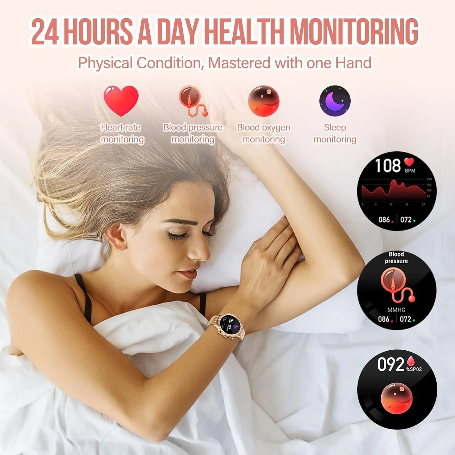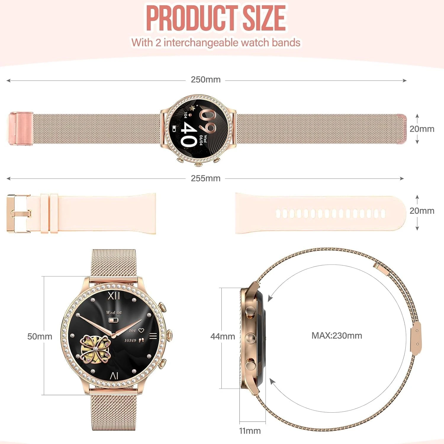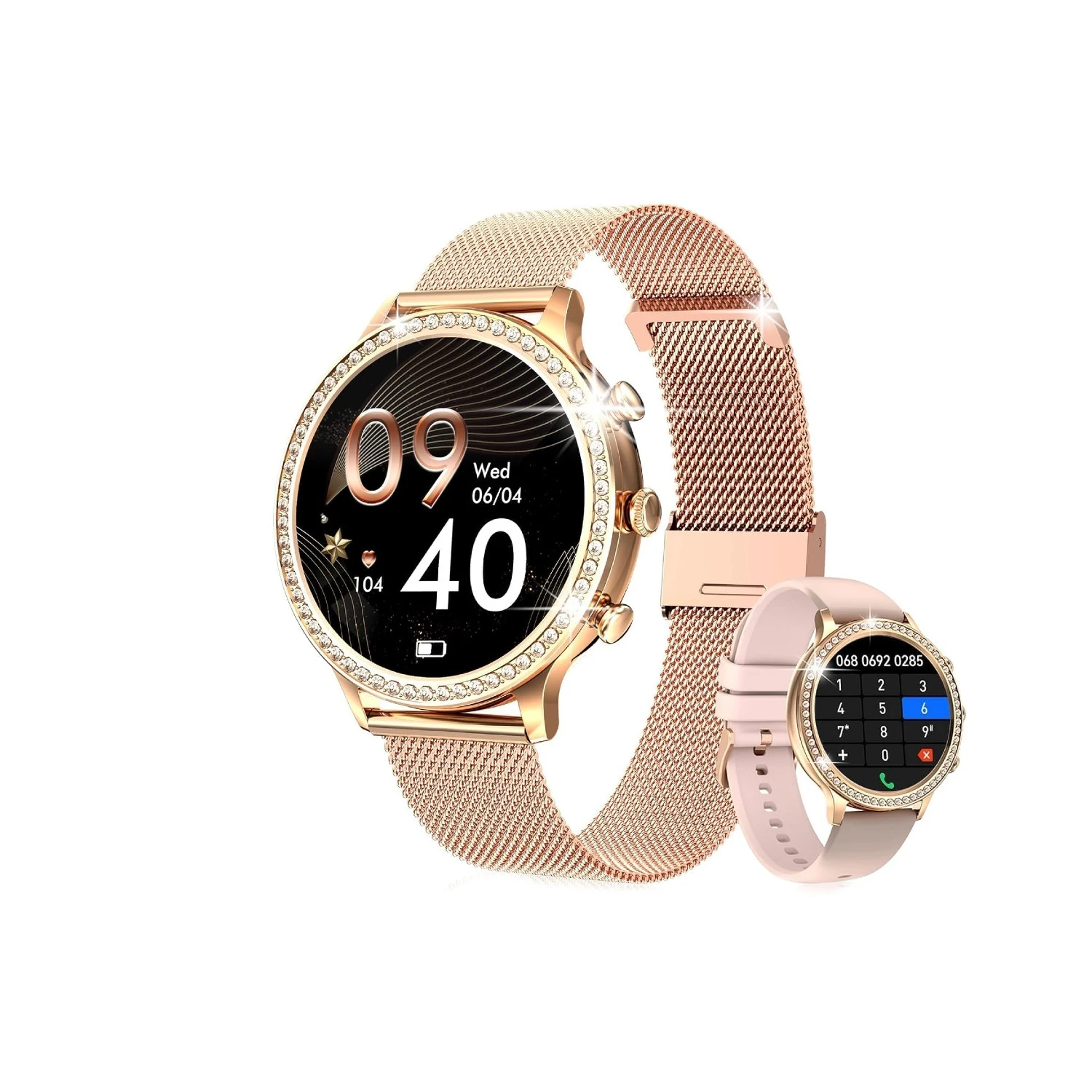 ⌚ Design Élégant et Polyvalent : Dotée d’un écran en verre haute dureté de 1,32 pouces, cette montre connectée affiche un charme extraordinaire avec une clarté et une vivacité impressionnantes. Elle est livrée avec deux bracelets interchangeables : un en acier milanais et un en silicone souple rose, vous offrant confort et élégance en toutes circonstances.
