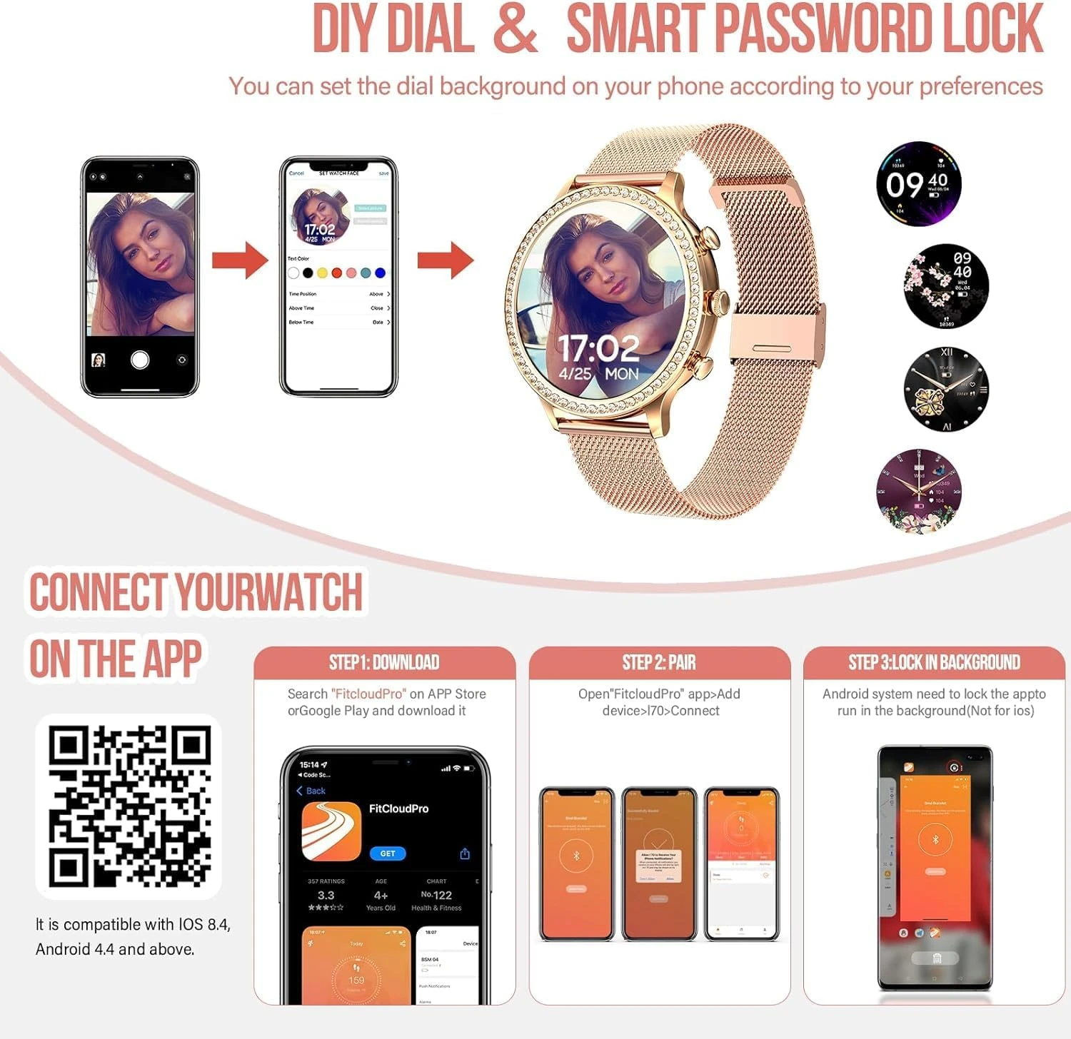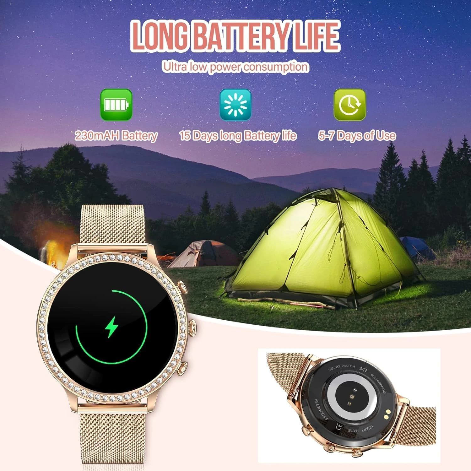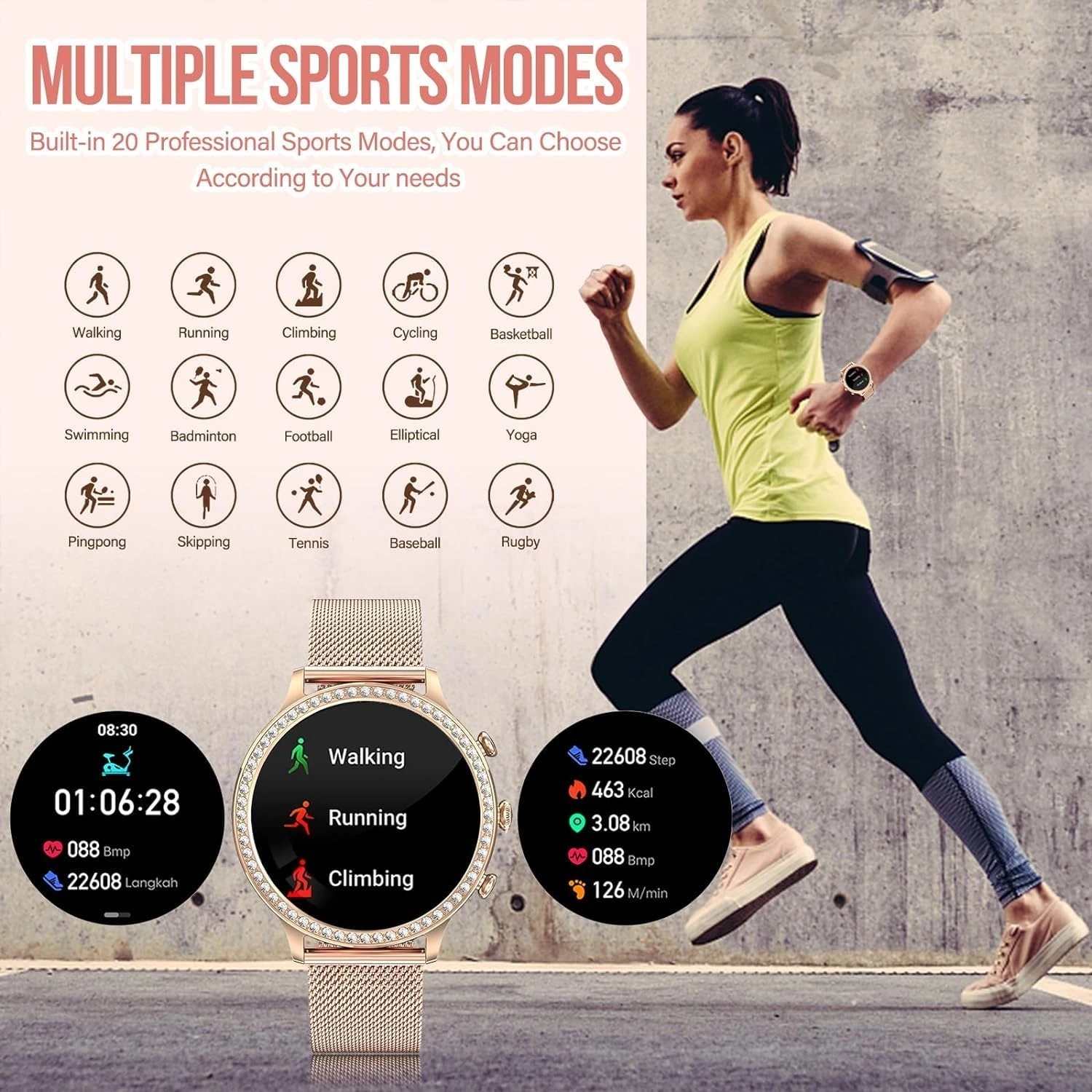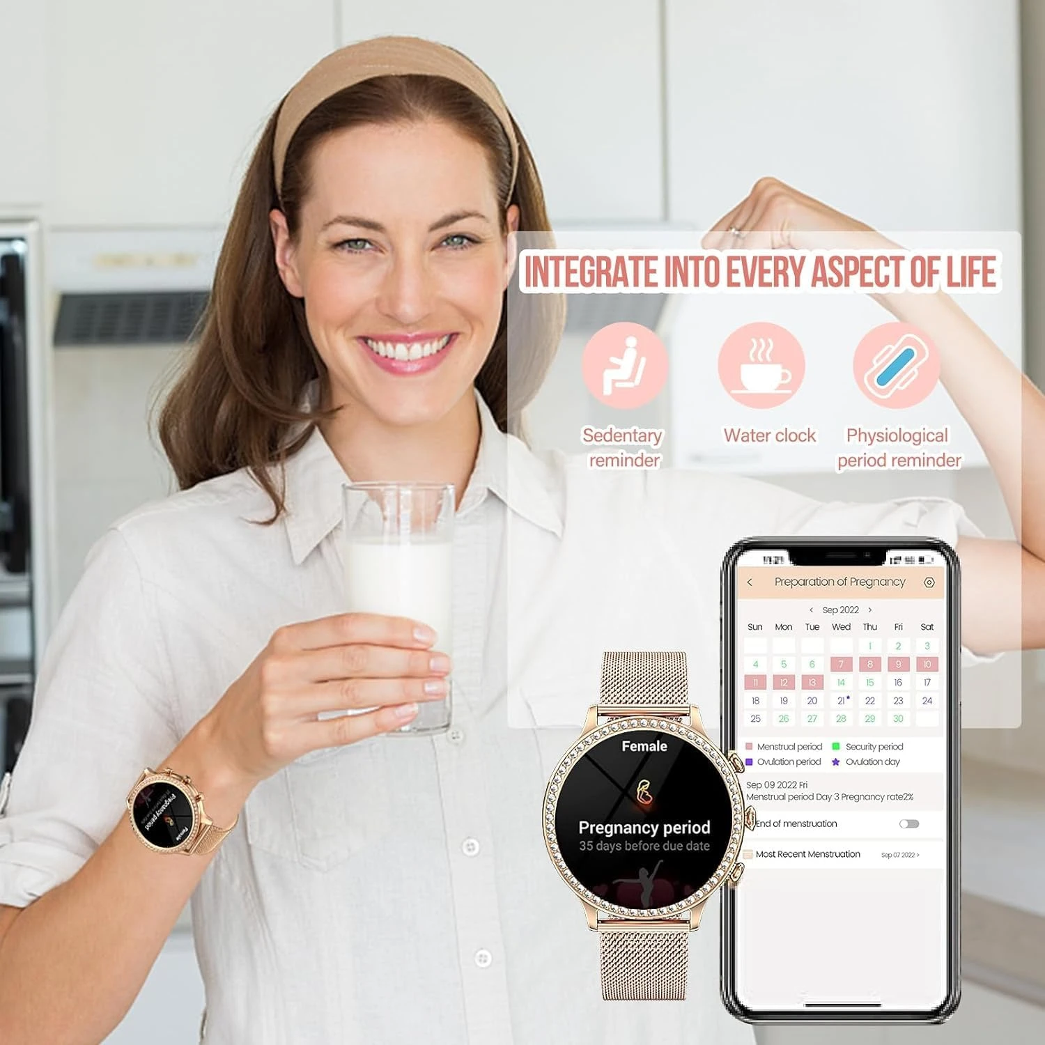 ⌚ Design Élégant et Polyvalent : Dotée d’un écran en verre haute dureté de 1,32 pouces, cette montre connectée affiche un charme extraordinaire avec une clarté et une vivacité impressionnantes. Elle est livrée avec deux bracelets interchangeables : un en acier milanais et un en silicone souple rose, vous offrant confort et élégance en toutes circonstances.