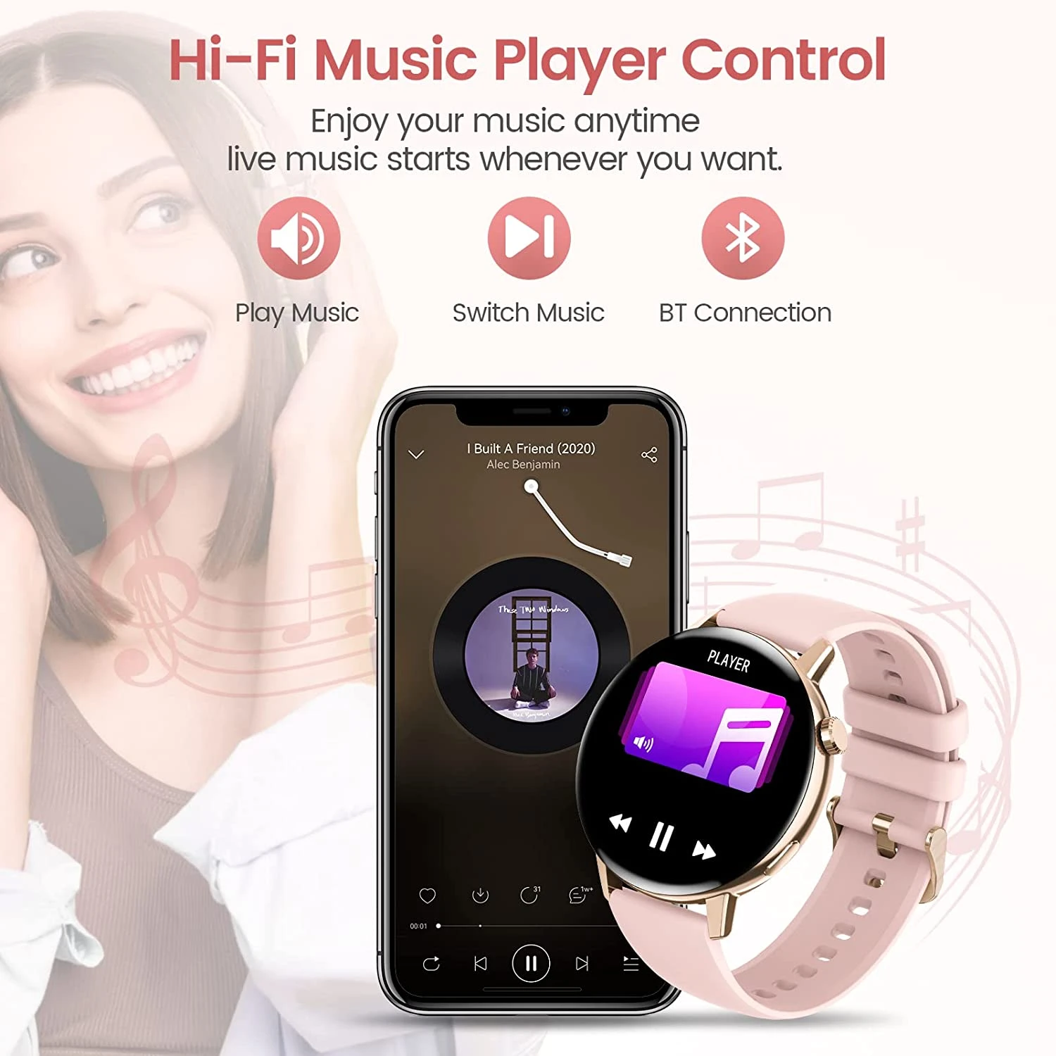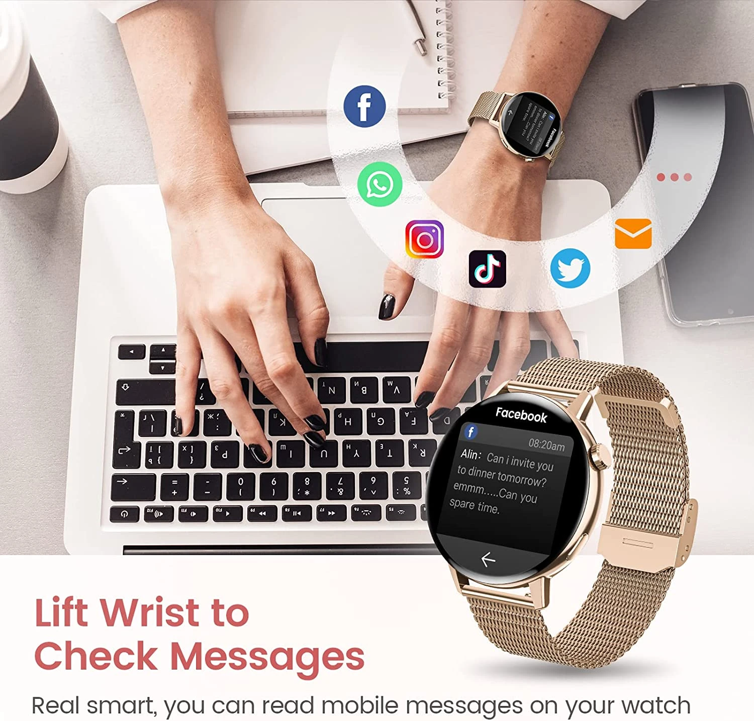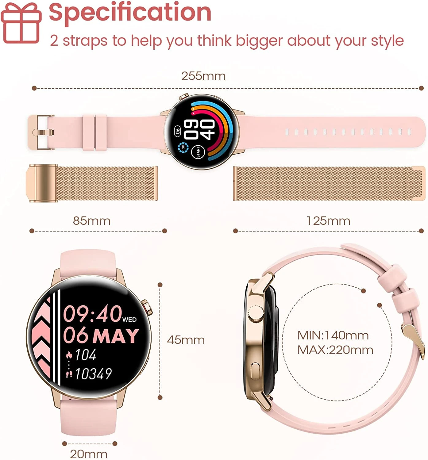 Notre montre dispose d’un écran tactile de 1,39 pouce, avec une résolution de 360×360, garantissant une expérience tactile fluide et agréable. Son design léger, pesant seulement 29 grammes, permet de la porter confortablement pendant de longues périodes sans aucune sensation de gêne. De plus, elle est proposée avec deux options de bracelet : un en acier or rose et l’autre en silicone rose, vous permettant de l’associer aisément à différents styles vestimentaires.