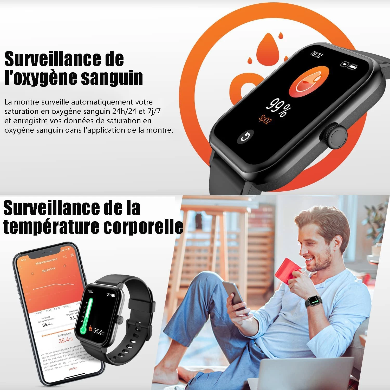 Notre montre intelligente réuni à elle seule près de 20 fonctions et en fait un outil utile améliorant votre quotidien. Elle peut par exemple mesurer la température corporelle, votre rythme cardiaque, votre sommeil, contrôler votre musique, être utilisée comme une lampe torche et bien d’autres. Une équipe est mise à votre disposition via notre onglet contact afin de répondre sous 24 heures à chacune de vos questions / demandes ✅.