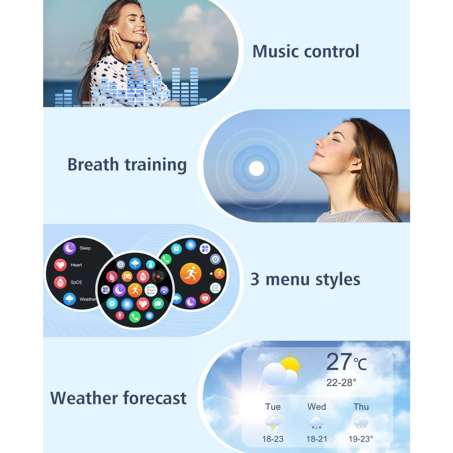 ⌚ Appels Bluetooth: Répondez facilement à vos appels téléphoniques grâce à la fonction Bluetooth de notre montre. Ne manquez jamais un appel important, que ce soit pendant vos déplacements ou vos séances d’entraînement.