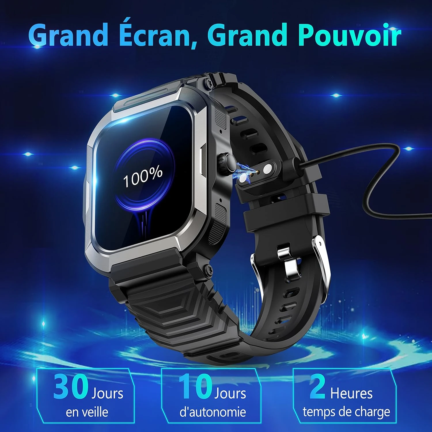 Explorez notre montre connectée militaire spécialement conçue pour les aventuriers, équipée d’un écran HD grand format de 1,91 pouces. Robuste et durable, elle résiste aux environnements les plus extrêmes, garantissant une performance fiable même dans des conditions telles que des températures élevées, la poussière, le brouillard salin et la basse pression.