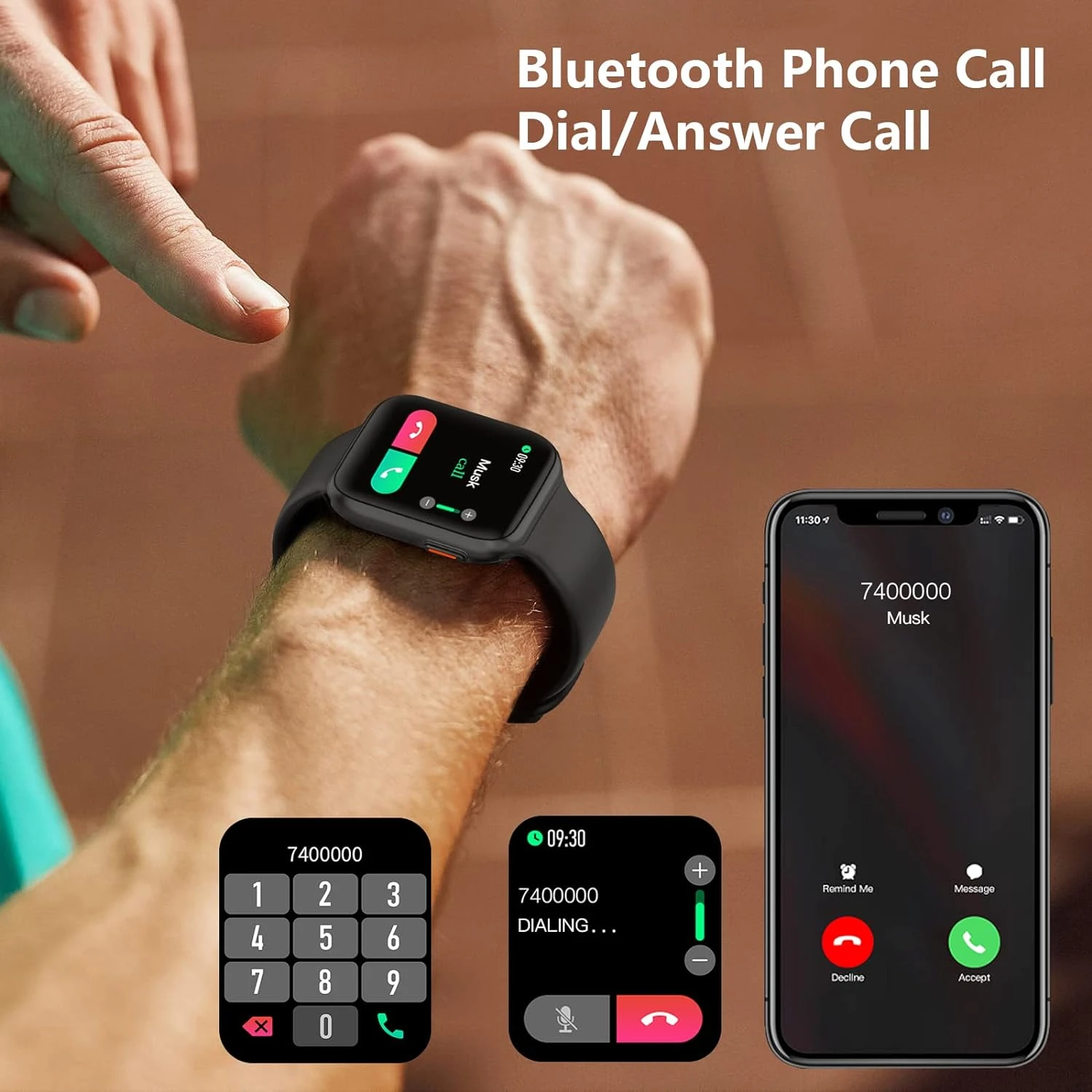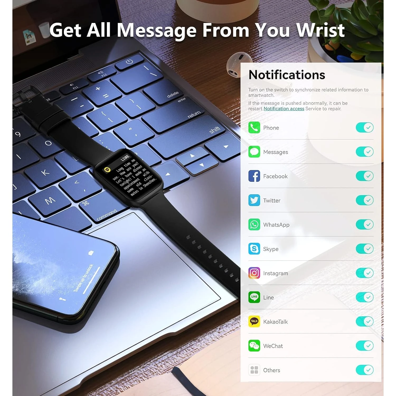 📞 Appel Bluetooth & Notifications Intelligentes Grâce au haut-parleur intégré et à la connexion Bluetooth, passez et répondez à des appels directement depuis votre poignet. Synchronisez vos contacts et consultez l’historique des appels pour une gestion facile. Recevez également des notifications de SMS et d’applications telles que Skype, Twitter et Facebook, assurant que vous ne manquiez aucune information importante.