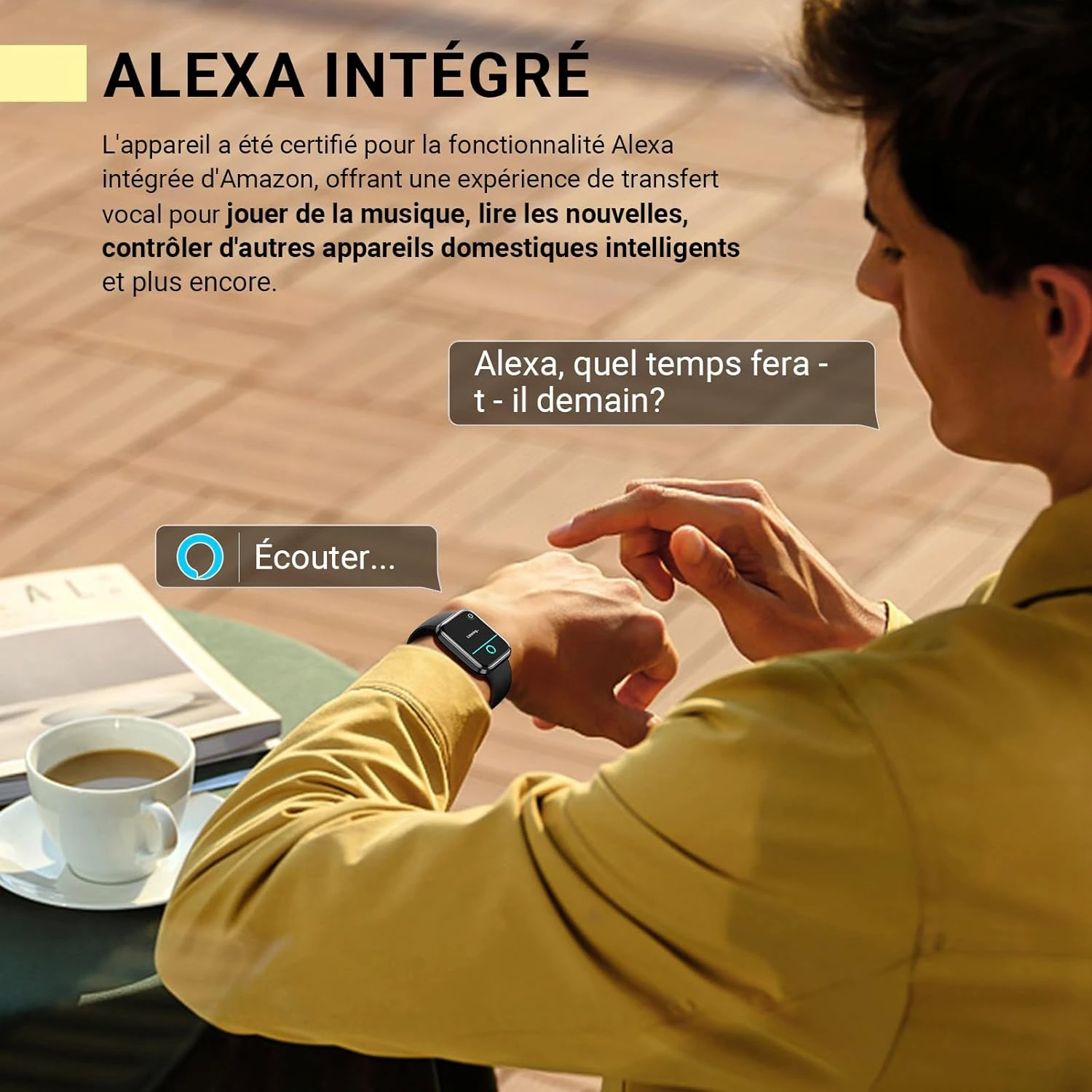 Avec cette montre connectée, vous pouvez passer et recevoir des appels sans sortir votre téléphone, grâce aux haut-parleurs intégrés et à la connectivité Bluetooth 5.3. L’intégration de l’assistant vocal Alexa permet de lancer des commandes vocales pour effectuer des recherches ou contrôler d’autres appareils intelligents, comme vos lumières ou votre télévision.