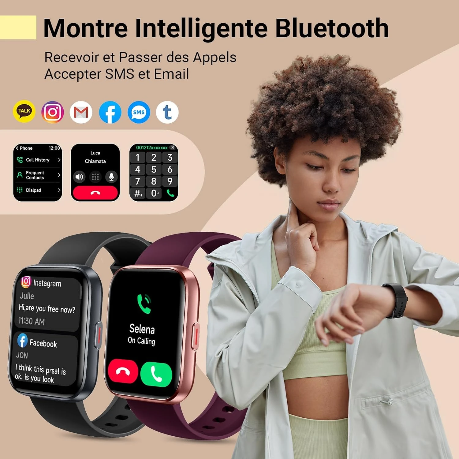 Recevez en temps réel toutes vos notifications importantes (Facebook, WhatsApp, Instagram, Twitter) directement au poignet. En plus des rappels d’information, la montre inclut des outils pratiques comme l’alarme, le chronomètre, le minuteur, ainsi que le contrôle de l’appareil photo et une fonctionnalité pour retrouver votre téléphone.