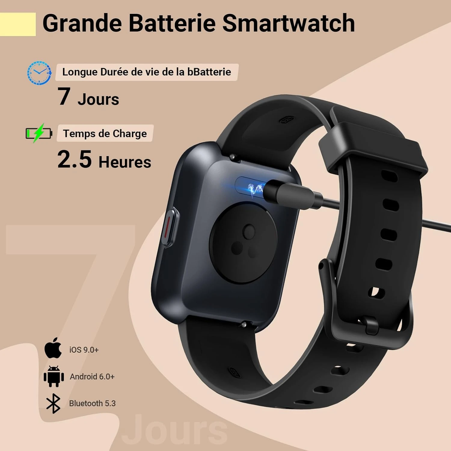 Dotée d’une batterie de 300 mAh, cette montre assure une autonomie de 7 à 10 jours pour un usage normal, et se recharge en seulement 2,5 heures. Vous pouvez ainsi rester connecté sans vous soucier de la batterie, même durant vos journées les plus intenses.