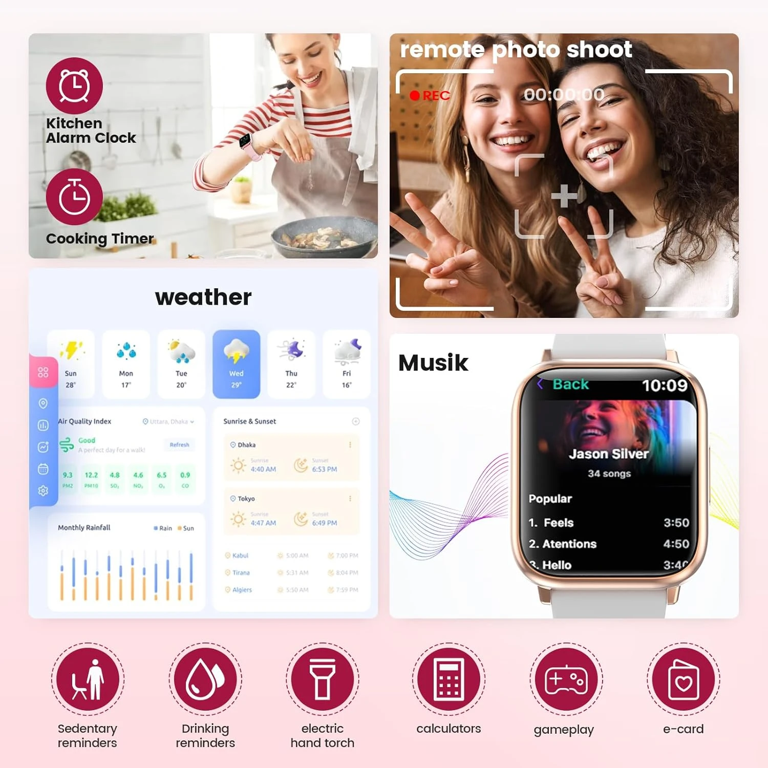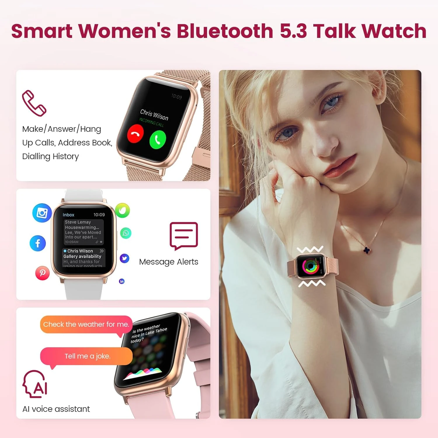 Connectez la montre à votre téléphone et contrôlez votre musique facilement : passez à la chanson suivante, mettez en pause ou changez de morceau sans sortir votre téléphone. Avec Bluetooth BLE5.3, restez à jour sur vos messages et notifications de WhatsApp, Instagram et autres plateformes sociales avec une portée de 8 à 10 mètres.