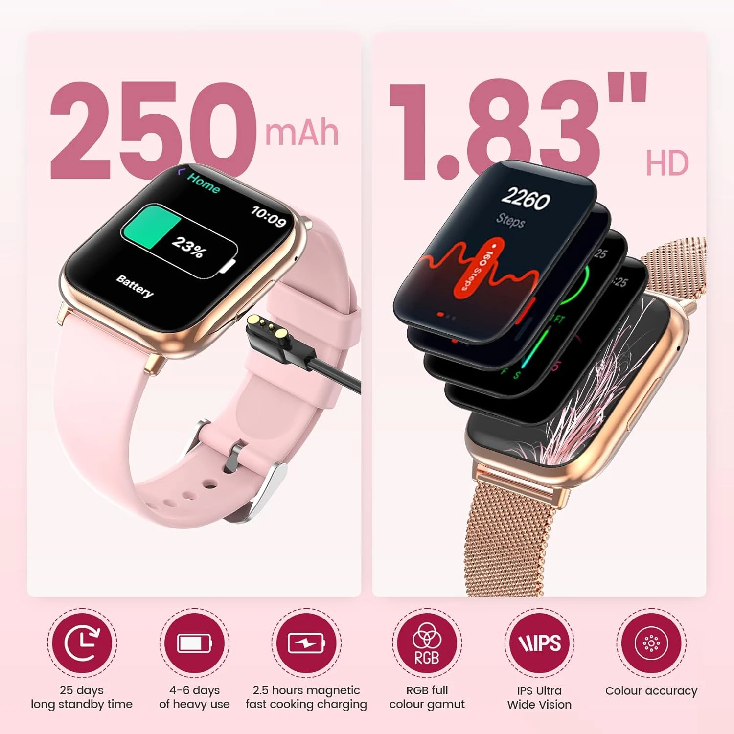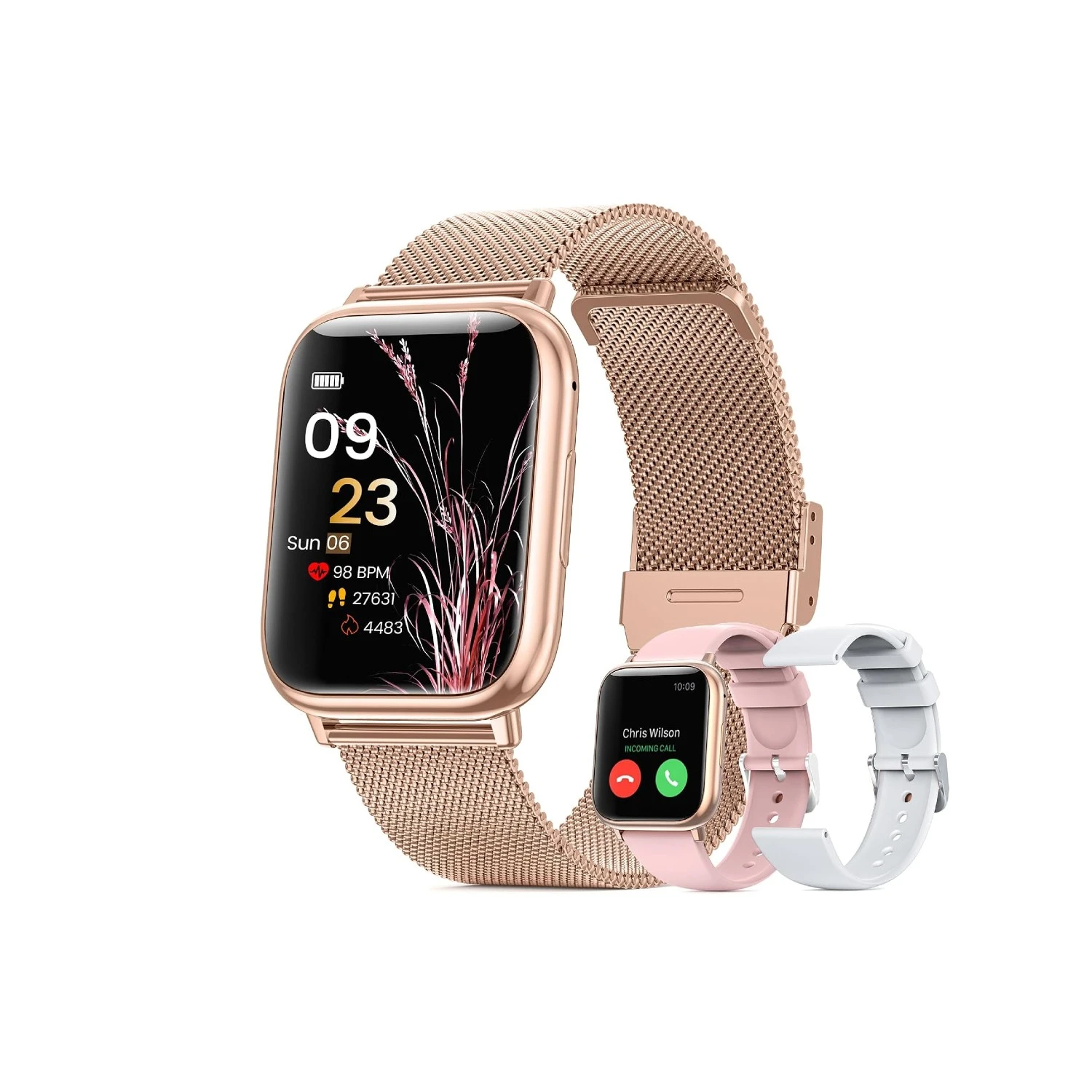 Profitez d’une expérience visuelle exceptionnelle avec son écran TFT de 1,83 pouce, haute résolution de 240 × 284, pour une clarté inégalée même en extérieur. Cette montre élégante en or rose inclut deux bracelets interchangeables pour adapter votre style à toute occasion.
