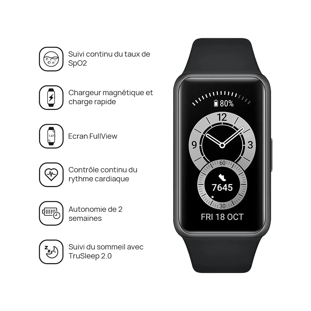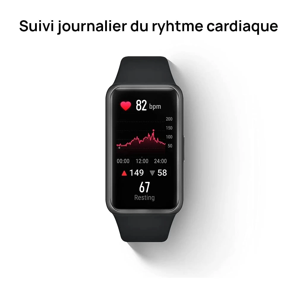 Notre montre connectée Huawei Band 6 a un écran HD FullView AMOLED de 1,47 pouces en forme rectangulaire et aux angles arrondis ❤️.
