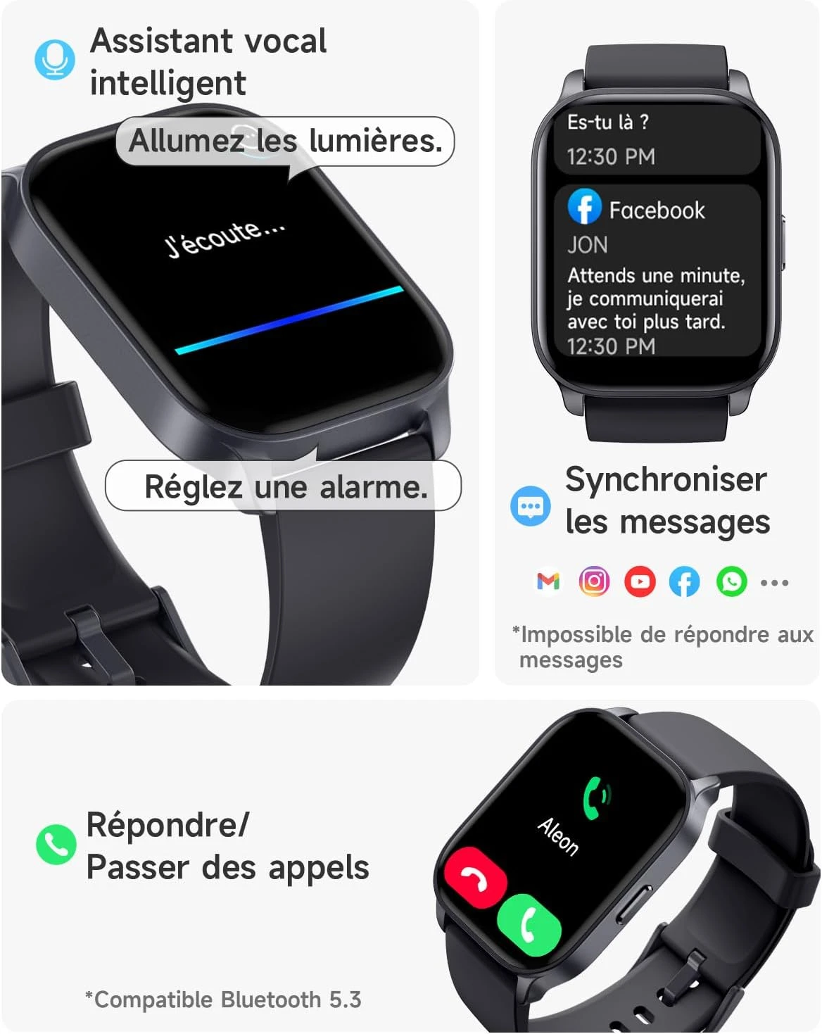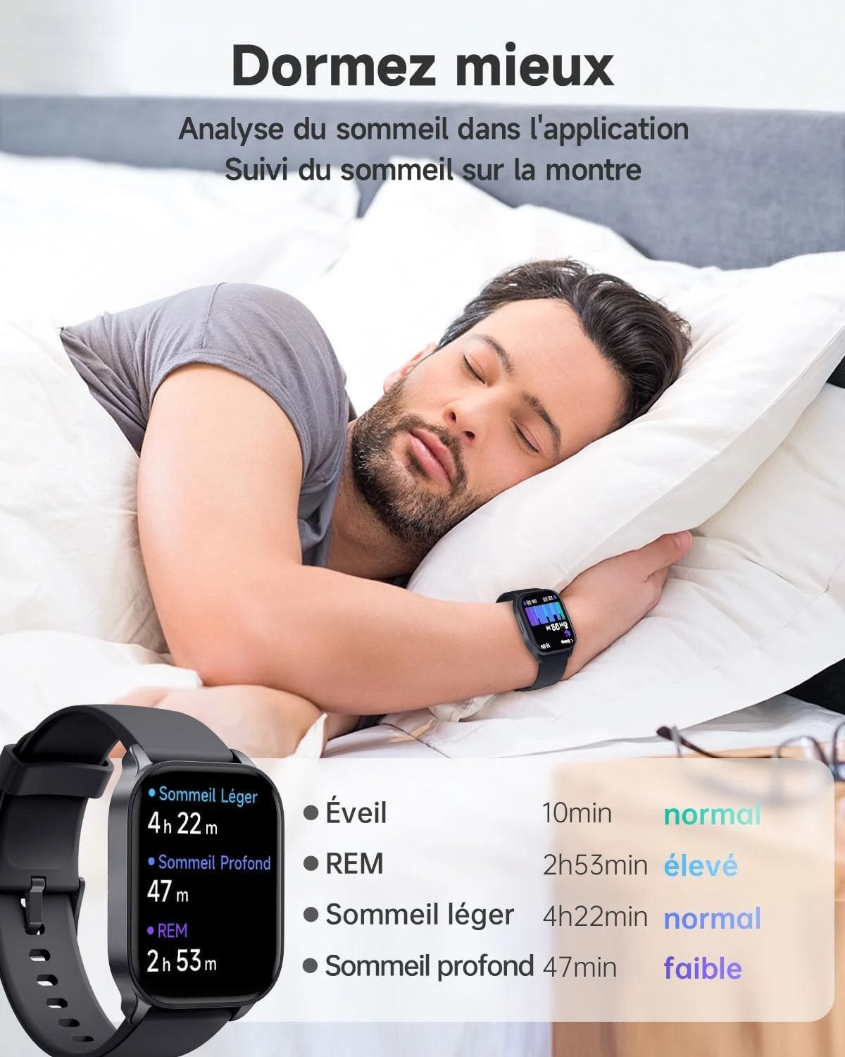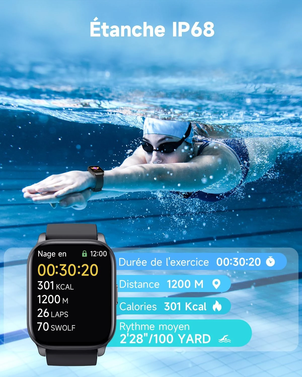 💪 Suivi de la Santé et de la Forme Physique Atteignez vos objectifs de bien-être avec notre montre de fitness. Surveillez en temps réel votre fréquence cardiaque, votre taux d’oxygène dans le sang et votre niveau de stress, avec des alertes instantanées en cas d’irrégularités. Choisissez parmi plus de 100 modes sportifs pour suivre vos pas, vos calories, votre distance et votre vitesse. Grâce à son étanchéité IP68, elle est idéale pour la natation.