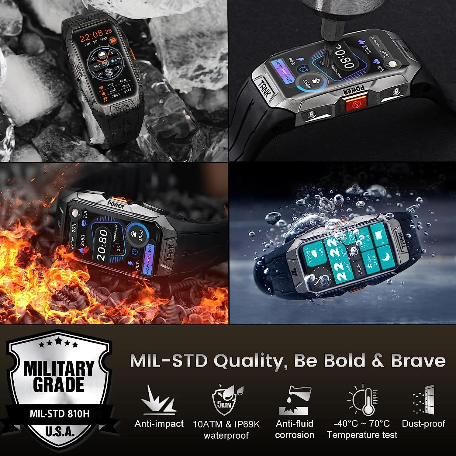 🔥 Vérification de Normes Militaires : Notre bracelet connecté est équipé d’un écran Corning Gorilla de 3ᵉ génération, résistant à tous types de chocs. Les boutons métalliques en alliage de titane TC4 et le design entièrement fermé assurent une robustesse exceptionnelle. Il a obtenu jusqu’à 15 certifications MIL-STD-810H, incluant des tests de haute et basse température, de pression, de pluie, d’exposition au soleil et d’impact, garantissant une utilisation fiable dans toutes les conditions difficiles.