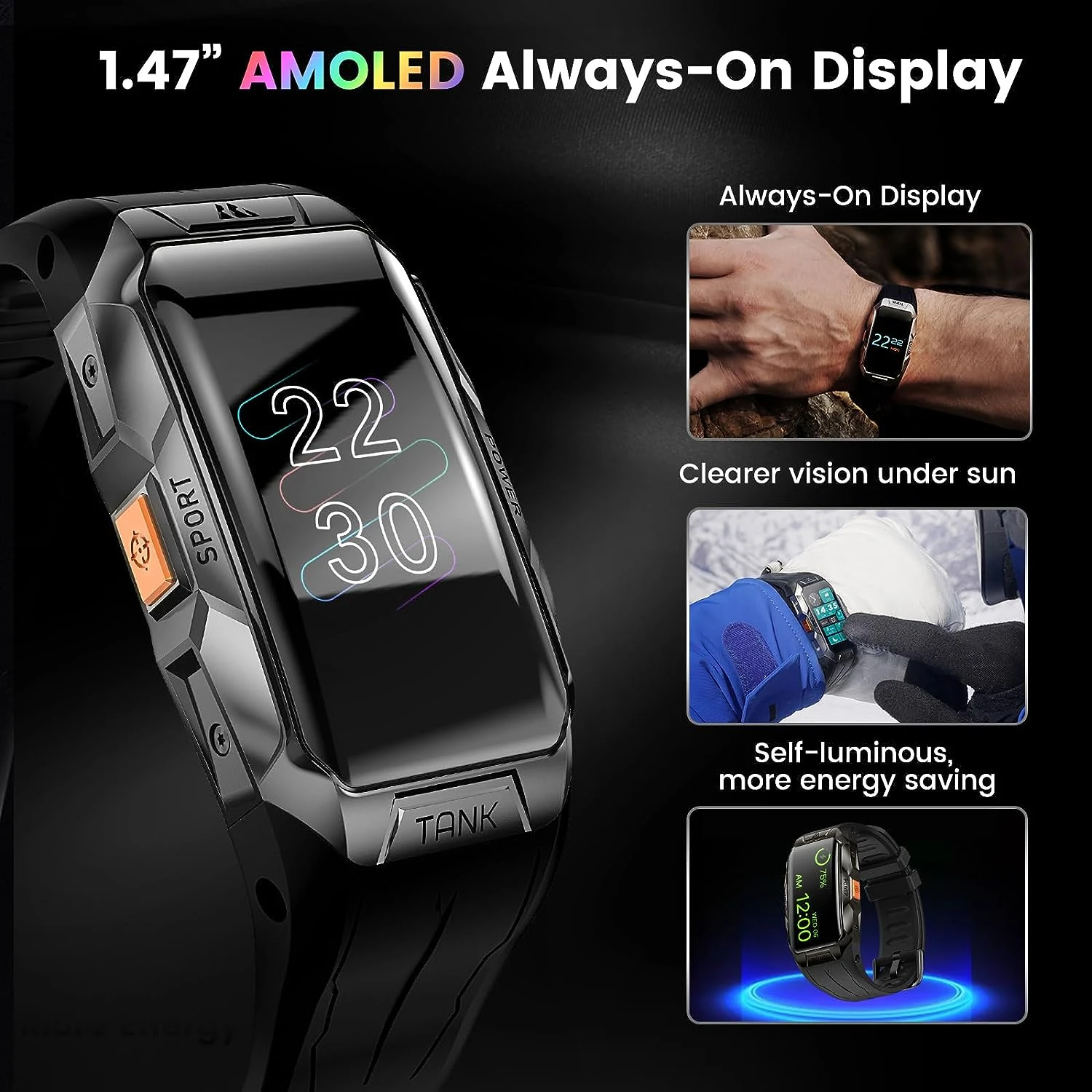 ⌚ 3D AMOLED Écran Incurvé & Always-On : Profitez d’une expérience visuelle inégalée avec notre écran couleur 3D AMOLED HD de 1,47 pouces. Ergonomiquement incurvé pour un confort optimal, il offre une gamme de couleurs 100 % RVB et une luminosité de 1000 NIT, doublant celle des autres trackers d’activité. Grâce à la fonction Always-On Display, l’heure reste visible sans avoir à lever le poignet ni toucher l’écran. De plus, l’écran AMOLED est 40 % plus économe en énergie par rapport aux écrans LCD.