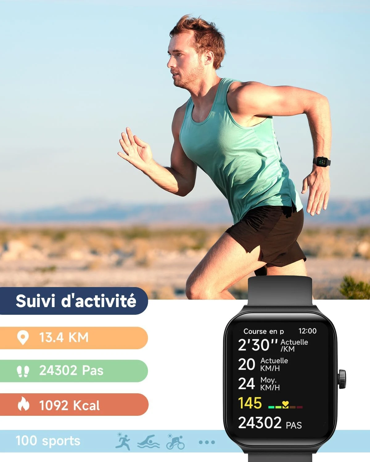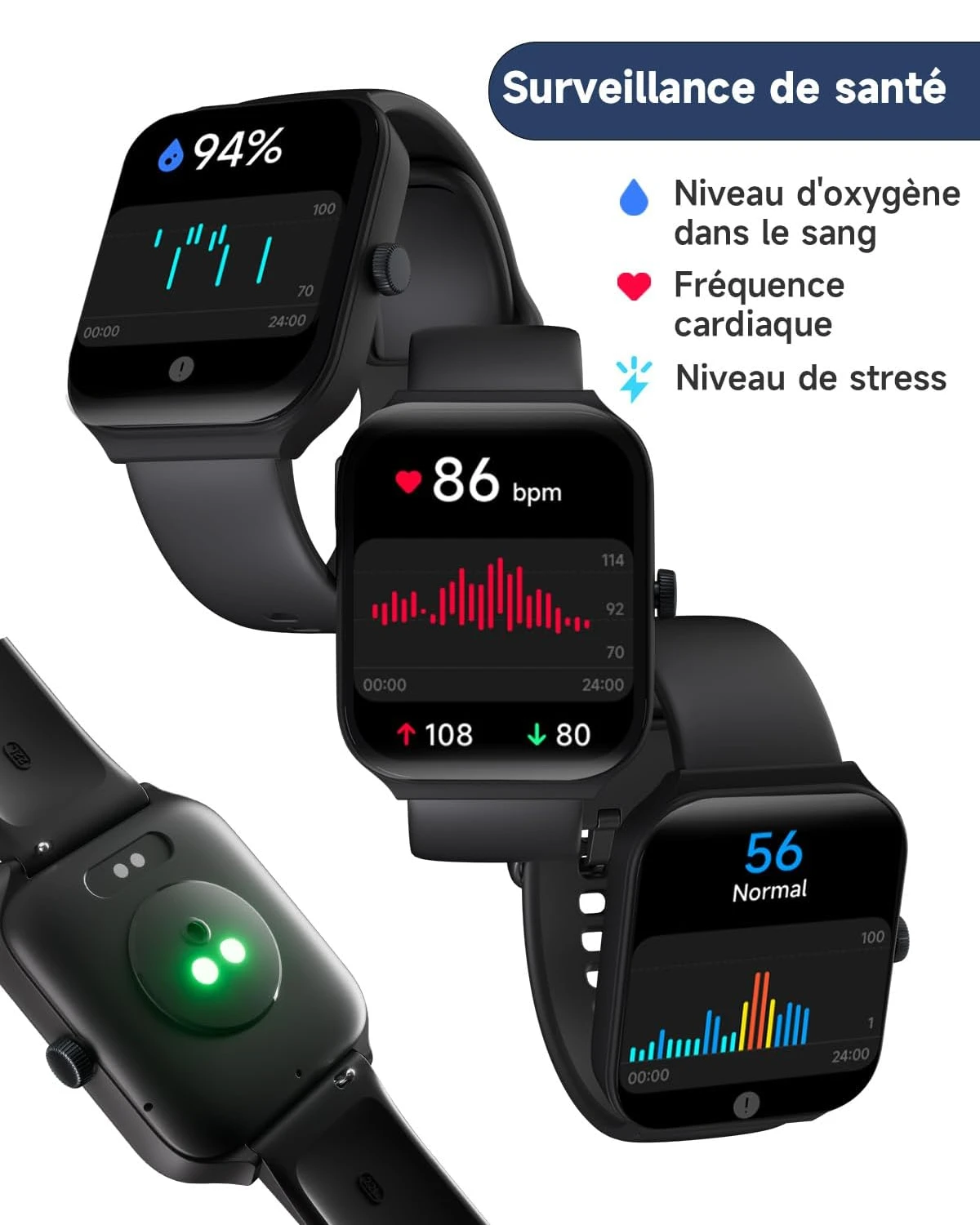 Plus qu’un simple accessoire pour votre téléphone, cette montre est également un partenaire idéal pour votre santé et votre forme physique. Surveillez votre fréquence cardiaque, votre taux d’oxygène dans le sang et votre niveau de stress en temps réel, recevez des alertes en cas d’anomalies. Avec 100 modes sportifs différents, suivez vos pas, les calories brûlées et la distance parcourue. De plus, avec une étanchéité IP68, cette montre est parfaitement adaptée à la natation, vous permettant de suivre vos activités aquatiques en toute confiance 😊.