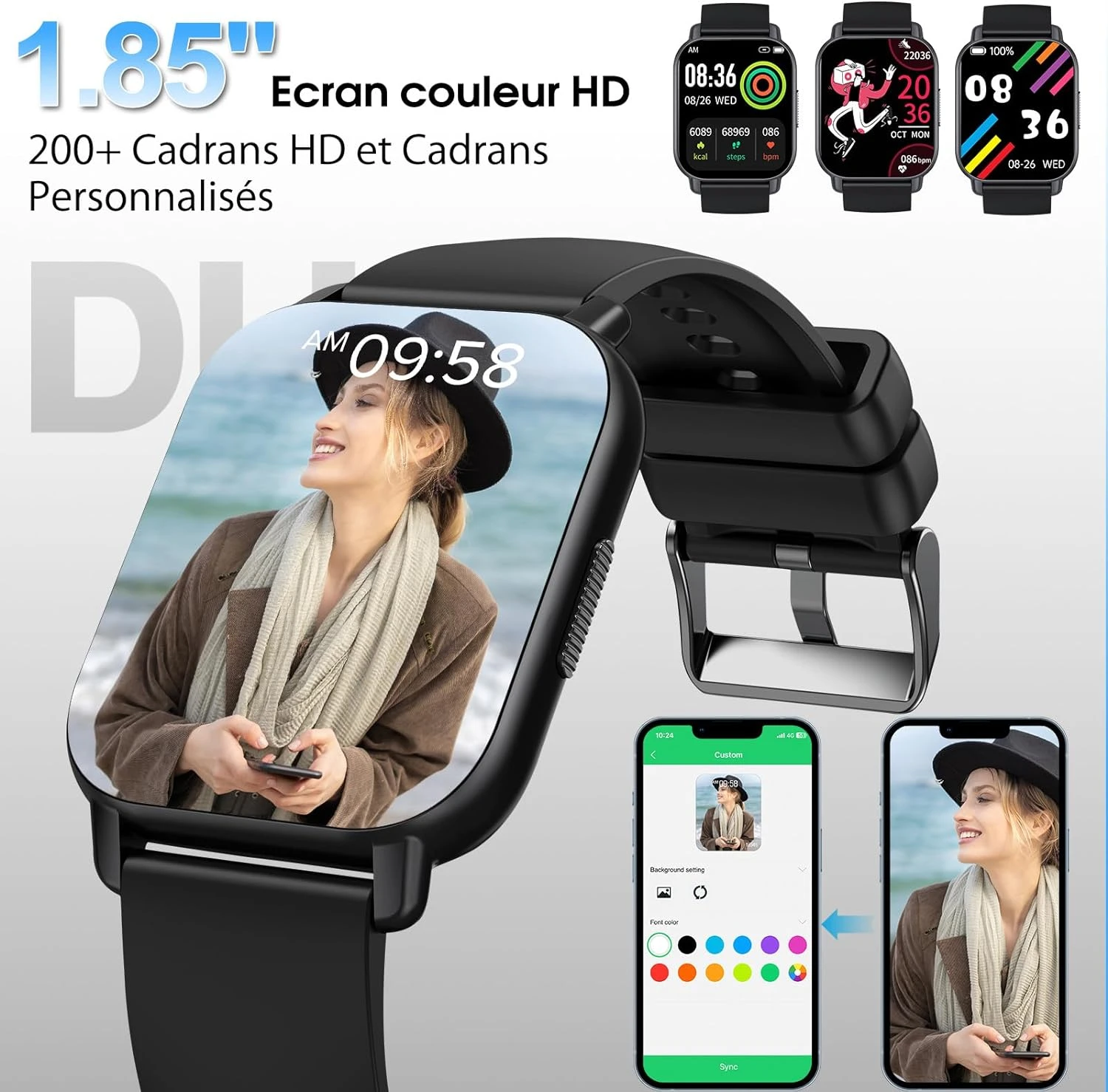 ✨ Cadrans et expérience tactile personnalisés : Dotée d’un écran tactile HD de 1,85 pouce, notre montre offre une qualité d’affichage exceptionnelle et une expérience utilisateur fluide. Choisissez parmi plus de 100 cadrans personnalisés ou utilisez vos propres photos pour une montre vraiment unique.