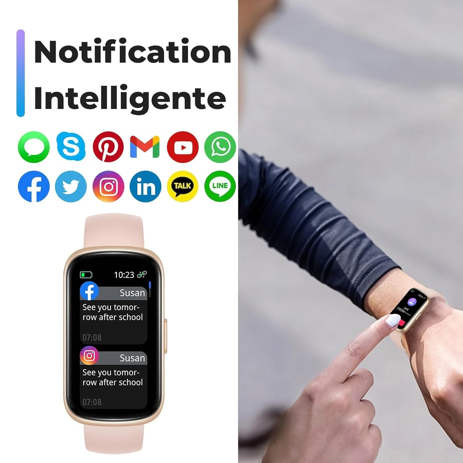 Restez connectée en toute simplicité ! Notre montre vibre discrètement pour vous avertir de vos appels, SMS et notifications sur les réseaux sociaux, vous permettant de rester informée sans sortir votre téléphone.