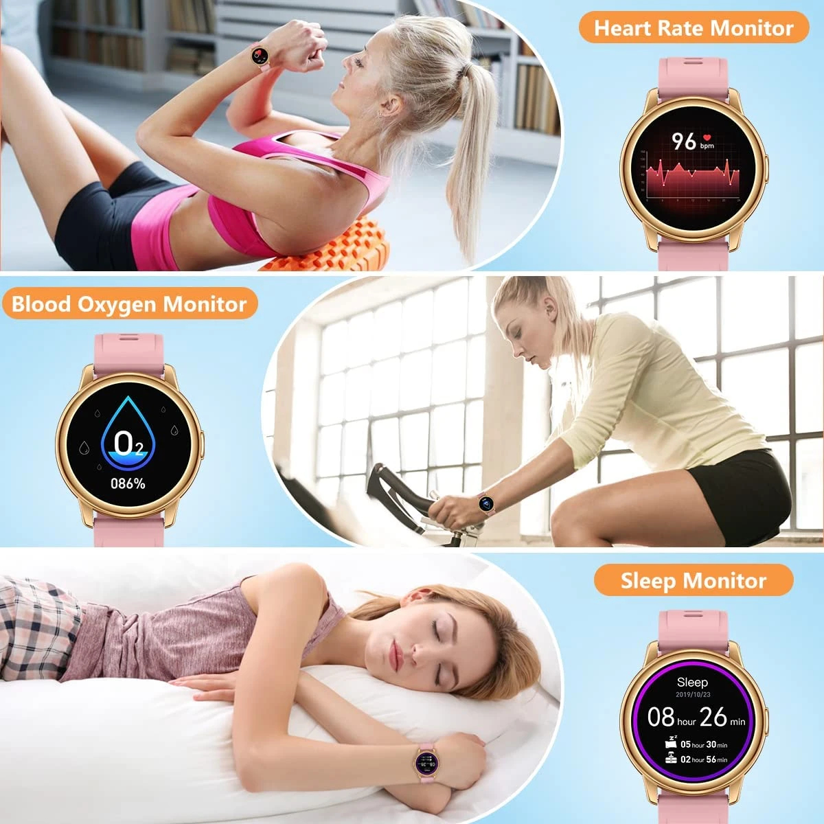 Notre montre intelligente pour femmes dispose d’une fonction permettant de contrôler la musique écoutée depuis son poignet. Elle a plusieurs capteurs surveillant le nombre de pas effectué, la pression artérielle ou encore l’oxygène sanguin ❤️.