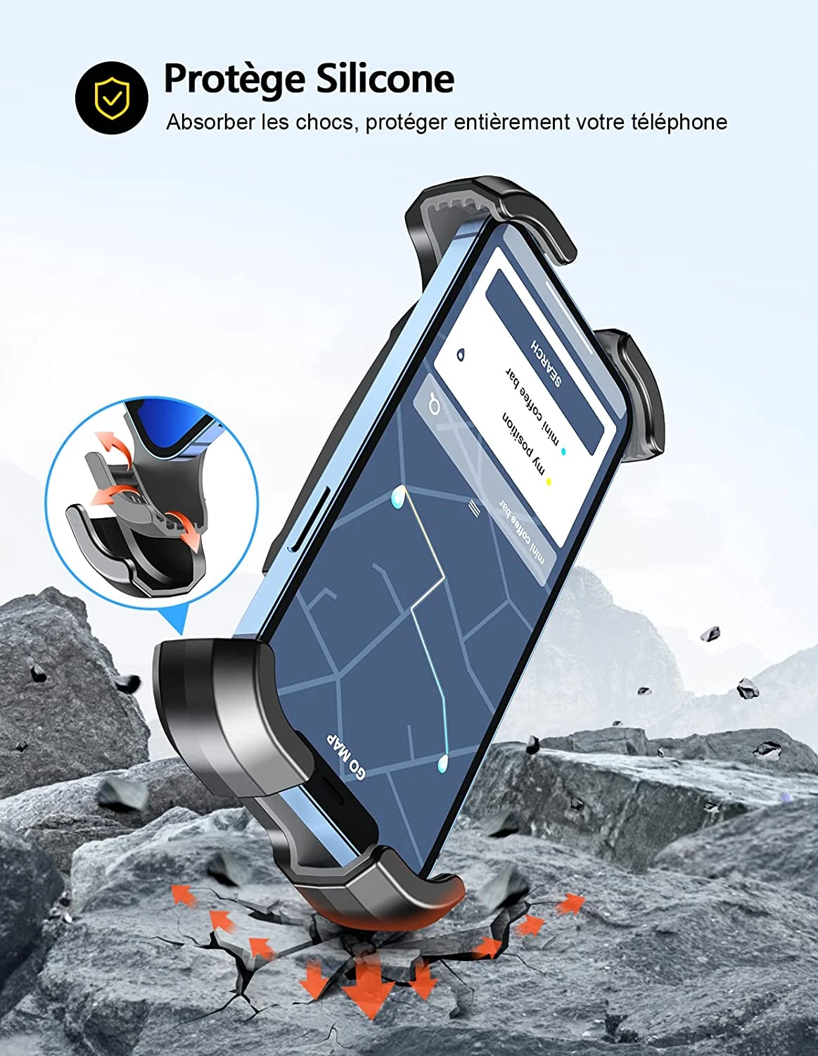 Pour protéger au mieux votre smartphone, ce support est doté de quatre coussinets en silicone et d’un coussin arrière intégralement en silicone. Ainsi, votre téléphone est préservé des rayures et des vibrations lors de vos trajets, garantissant une protection durable et efficace.
