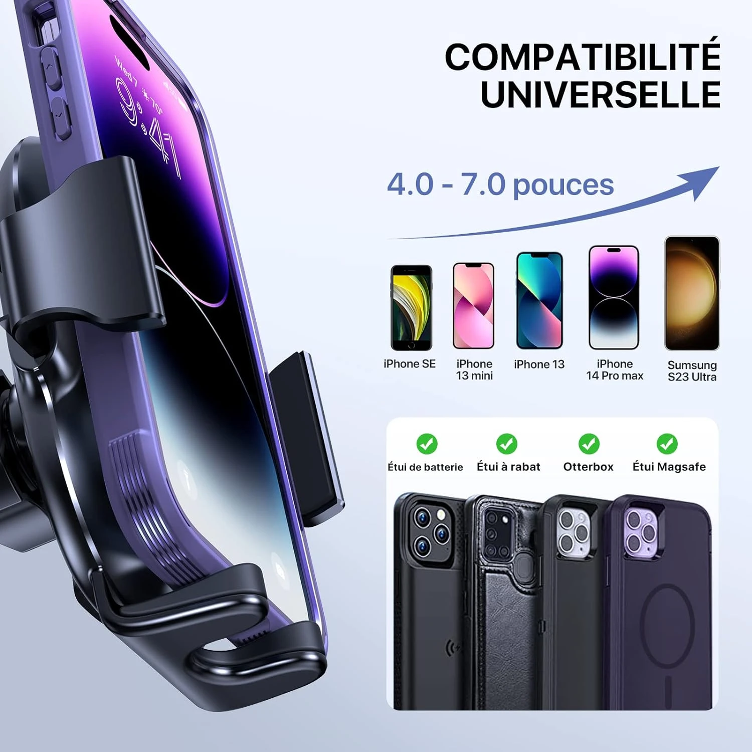 Avec notre Porte Téléphone Voiture, vous bénéficiez d’une solution de montage fiable et polyvalente pour votre téléphone en voiture. Offrant une fixation sûre, une résistance aux secousses, une rotation à 360 degrés et une compatibilité universelle, notre support vous permet de rester connecté tout en conduisant en toute sécurité. Ne laissez plus jamais votre téléphone glisser ou tomber pendant que vous êtes sur la route, choisissez notre support pour une conduite sans souci.