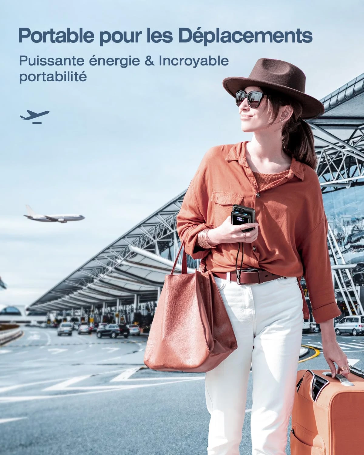 La conception de notre chargeur portable est à la fois confortable et sûre. Fabriqué à partir de matériaux de haute qualité et résistant aux chutes, il est doté d’un design ergonomique offrant une sensation mate confortable dans la main. De plus, il intègre une puce de contrôle intelligente qui surveille et contrôle avec précision le processus de charge, protégeant ainsi la santé de la batterie et évitant les surcharges, les surtensions, les surintensités et les courts-circuits ✅.