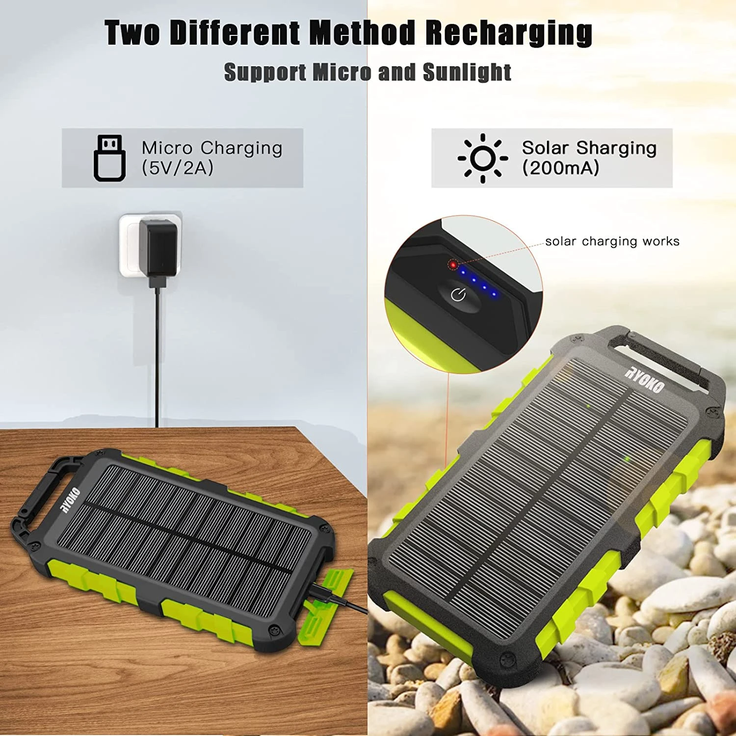 Notre Batterie Externe Solaire de 20000 mAh est certifiée IPX4 lui permettant ainsi de résister aux conditions climatiques les plus rudes et aux fortes projections d’eau (ne résiste cependant pas à l’immersion). Sa grande capacité lui permet de recharger approximativement quatre fois un smartphone ❤️.