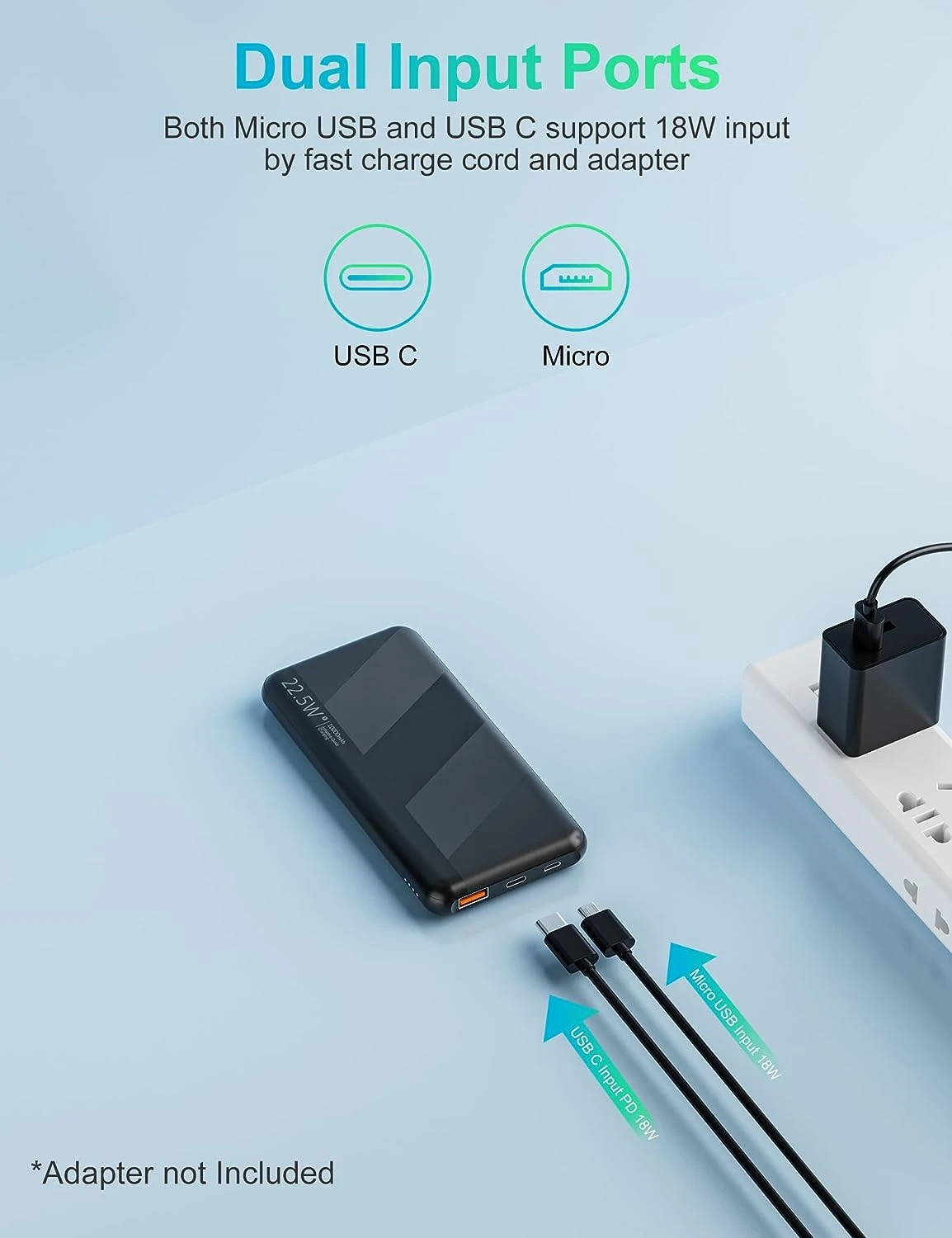 Notre banque d’alimentation est équipée de deux sorties (USB-C, Micro) pour une compatibilité maximale avec la plupart des appareils du marché. Les ports USB-C IN et OUT garantissent des opérations de charge et de recharge plus rapides que jamais. En utilisant un câble PD et un adaptateur PD, votre PowerBank peut être entièrement rechargé en seulement 3 heures, soit 2 heures de moins que les autres solutions.