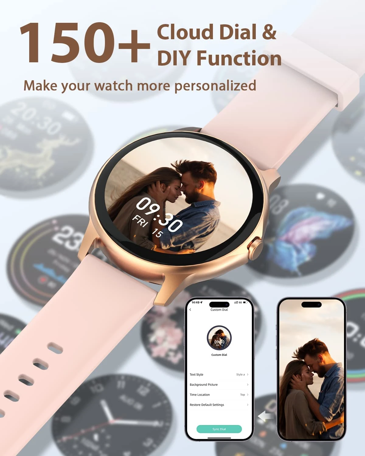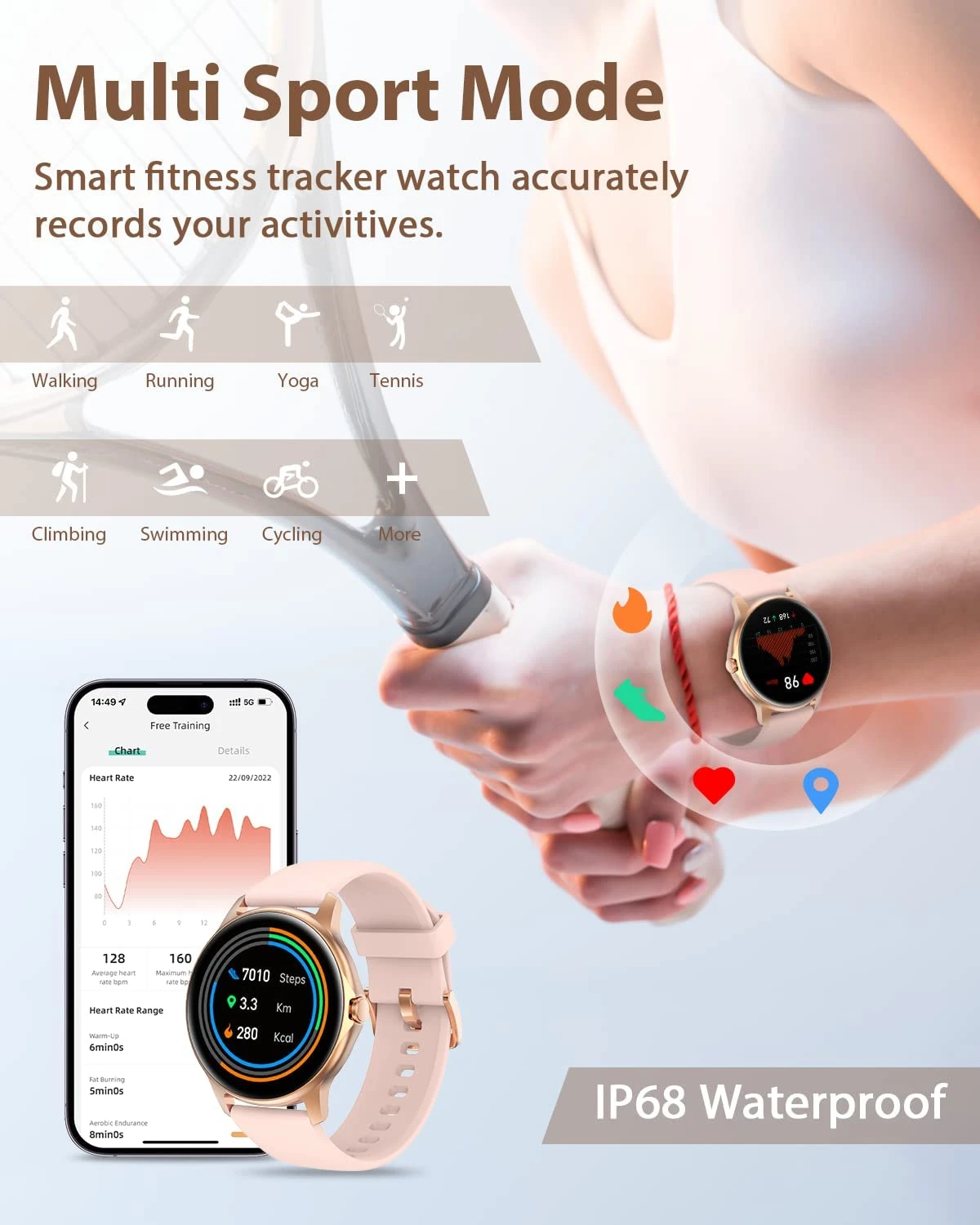 Son design Rose et Doré élégant comprend également des fonctions de suivi de l’activité physique, comme le suivi de la fréquence cardiaque et le décompte des pas 🔥.