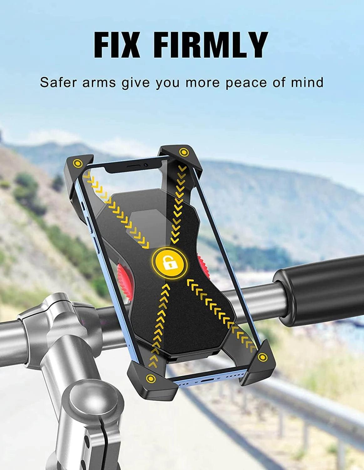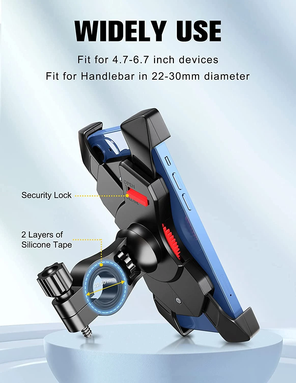 Avec deux coussinets en silicone inclus, ce socle s’adapte parfaitement aux guidons de 22 à 30 mm de diamètre. Outre les vélos et les motos, il convient aussi aux poussettes, chariots, scooters électriques, et même aux tapis de course. Emportez votre téléphone où que vous alliez, dans toutes les situations !