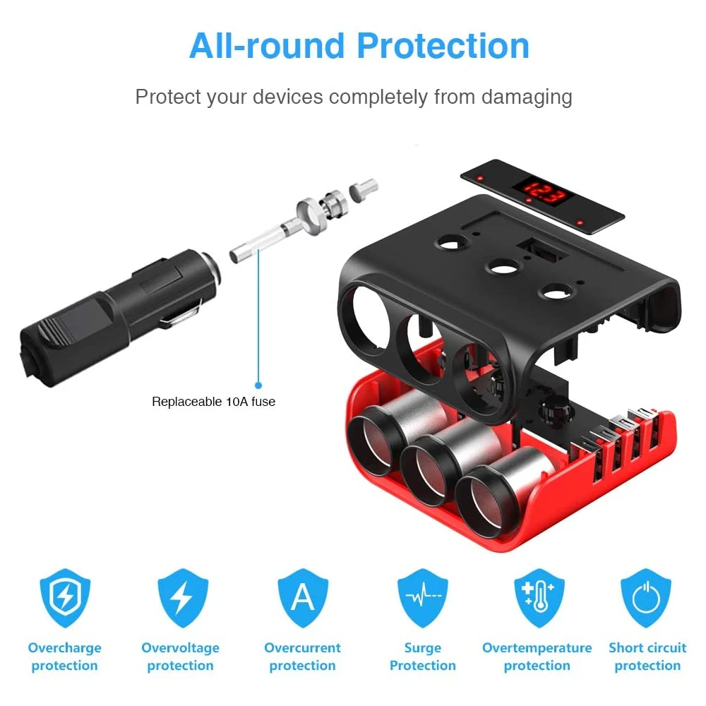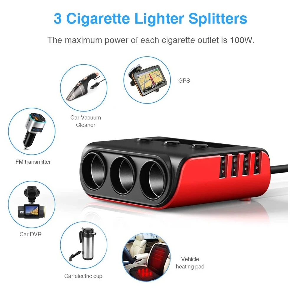 Notre Chargeur Allume Cigare a 3 prises allume-cigare (d’une puissance de 100w maximum) et 4 ports USB classique rechargeant tous les différents appareils possibles et le rendant compatible universellement ❤️.