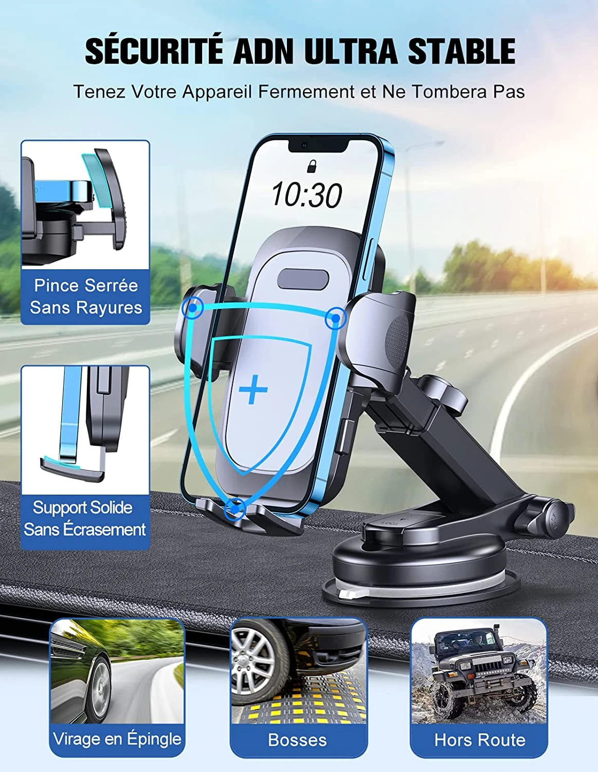 👆 Fonctionnement d’une seule main et installation facile : Avec son déverrouillage à un bouton, vous pouvez facilement fixer ou retirer votre téléphone en une seconde, d’une seule main. Ce support s’installe aisément sur le tableau de bord, le pare-brise ou tout autre endroit plat de la voiture.