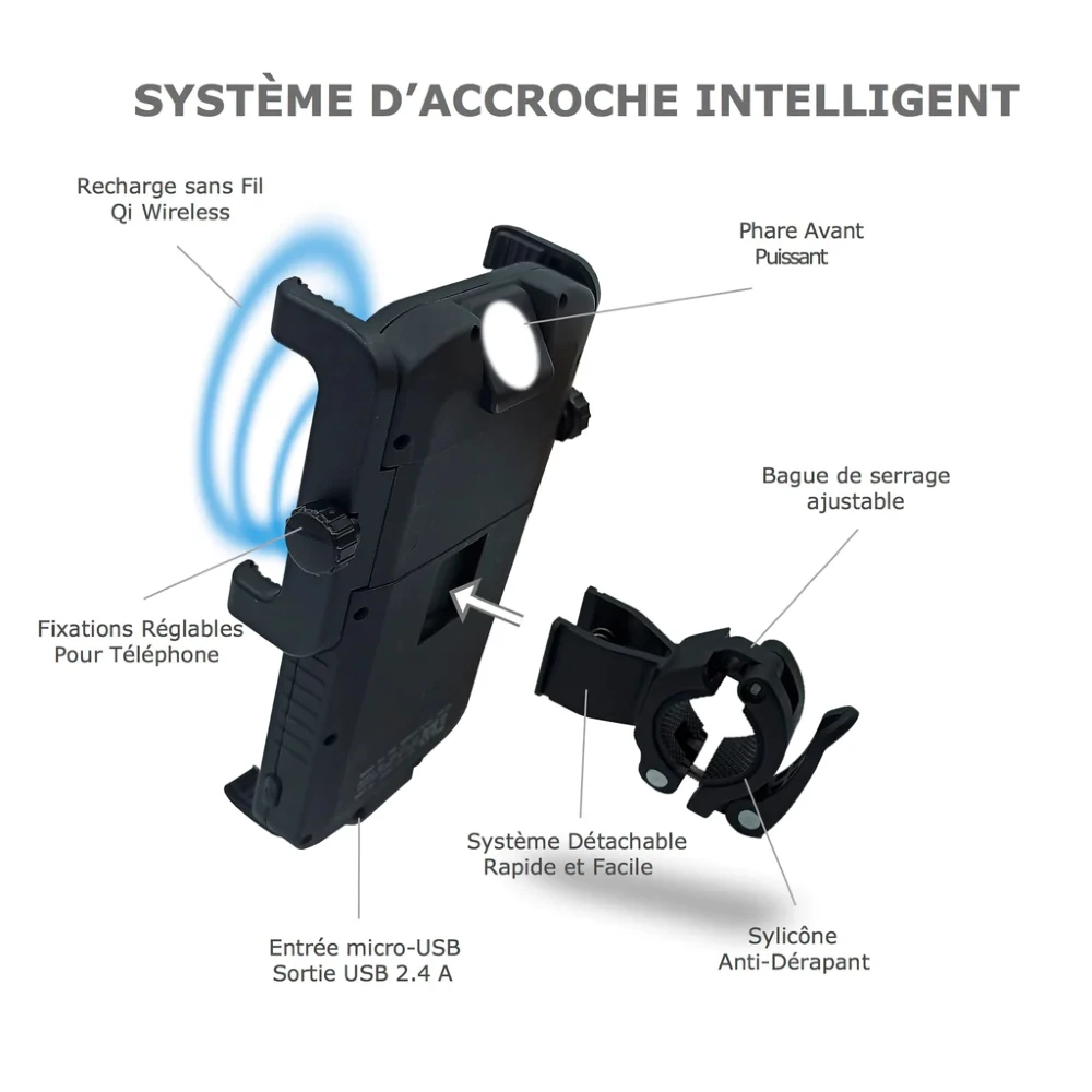 Elle possède un système de charge sans fil permettant au smartphone une fois posé dessus d’être rechargé automatiquement. Ce support peut se charger à la maison ou directement durant le trajet à moto afin de ne jamais tomber en panne d’énergie.