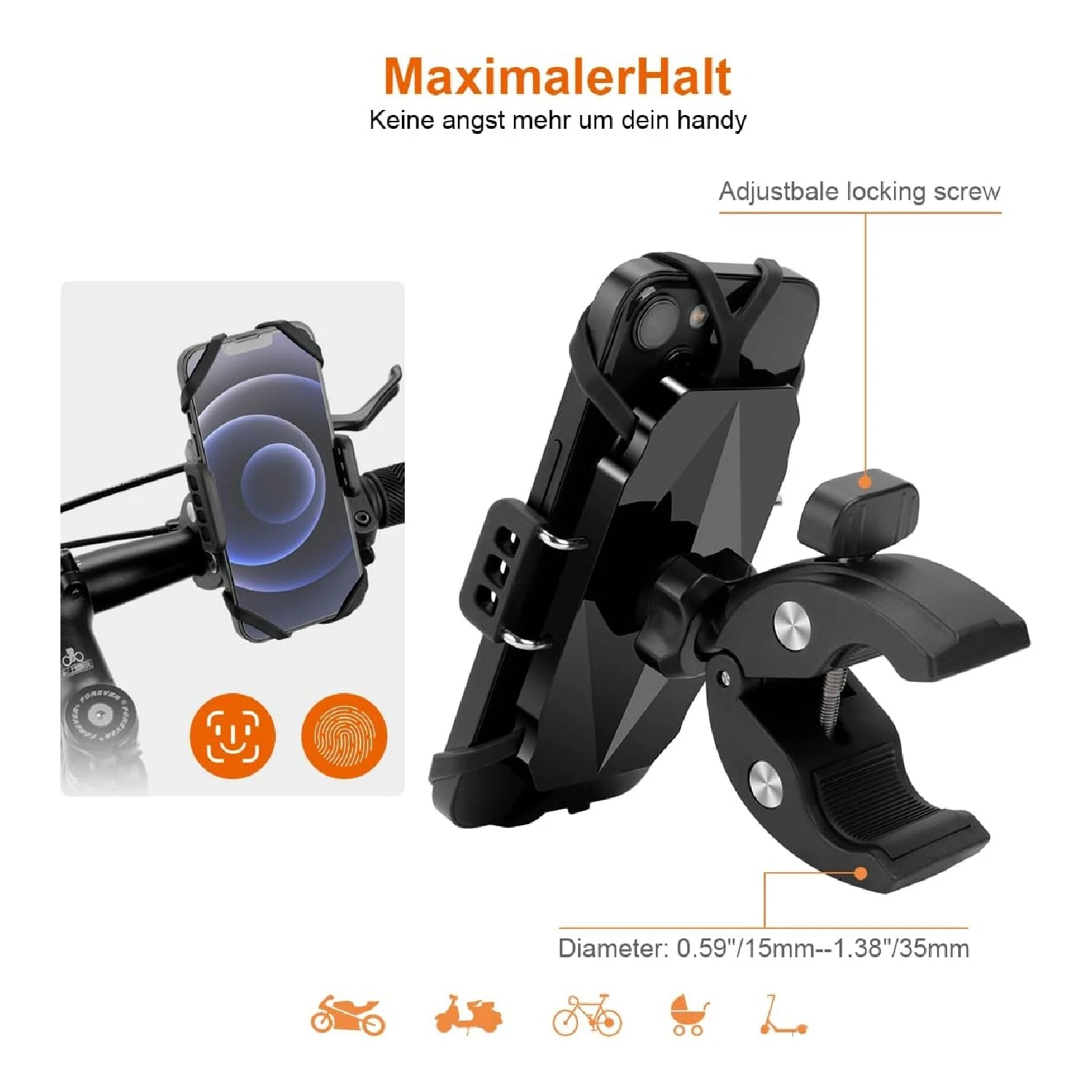 🔧 Installation rapide et sans outils : notre support dispose d’une pince de fixation rapide, qui permet une installation ultra simple et sans outils. Il vous suffit d’appuyer sur le bouton pour ouvrir la pince et la fixer sur le guidon (diamètre entre 15 et 35 mm), avant de serrer la vis manuelle. Pratique pour une utilisation sur vélos, motos, poussettes, tapis de course, scooters et même fauteuils roulants.