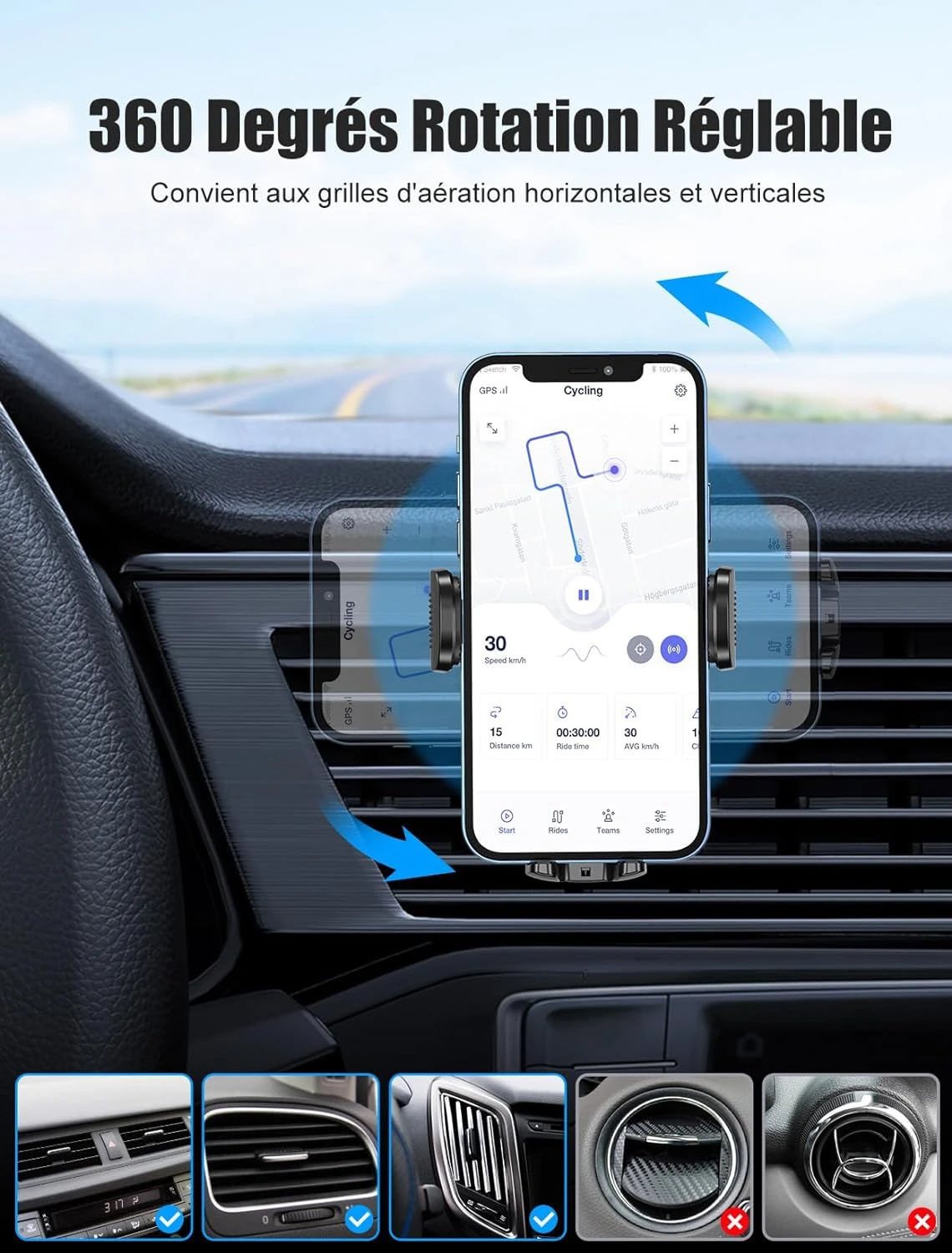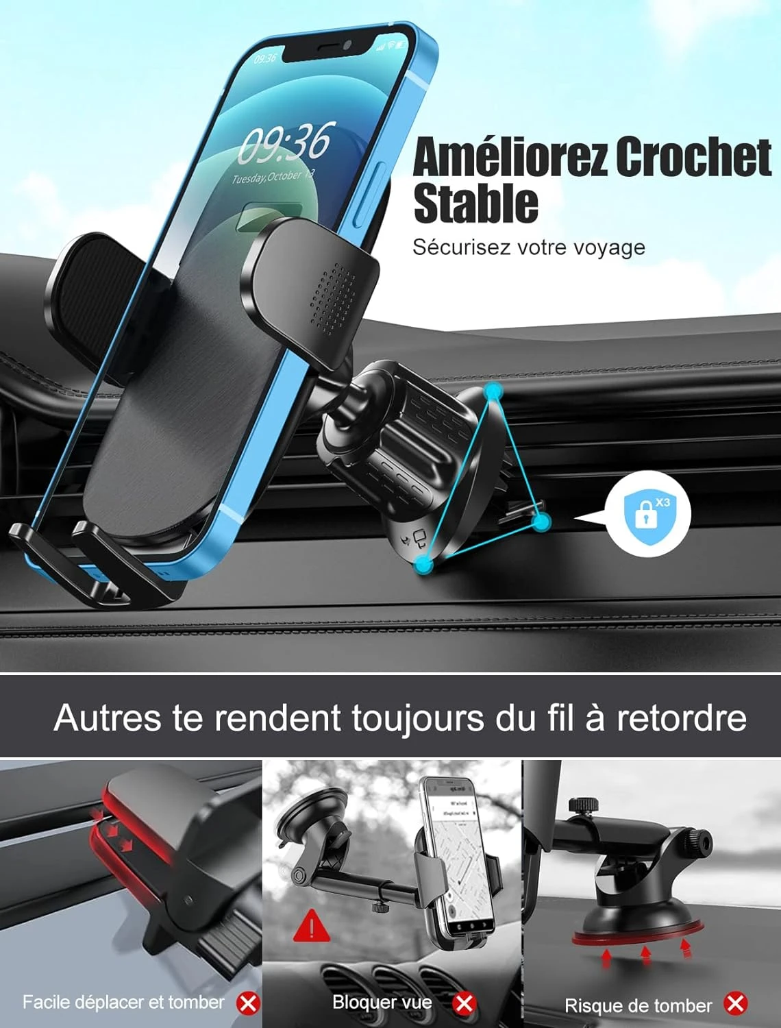 Conception Unique du Crochet : 🔒 Doté d’un crochet de verrouillage amélioré, notre support assure une fixation solide aux lames de sortie de votre véhicule, garantissant ainsi que votre téléphone reste en place même sur les routes cahoteuses ou lors d’une utilisation prolongée. Sa conception unique évite tout risque de chute, assurant ainsi la sécurité de votre appareil.