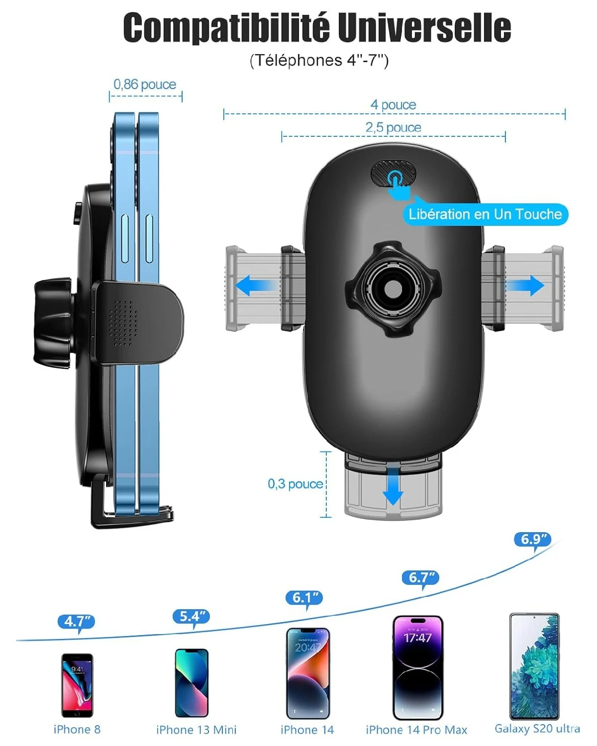 Support Universel : 📱 Compatible avec une large gamme de téléphones et d’appareils, notre support convient aux smartphones de 4 à 7 pouces, même avec des coques épaisses. Que vous utilisiez un iPhone (par exemple un iPhone 12 Pro Max), un Samsung Galaxy, un Huawei ou tout autre appareil, notre support est là pour vous offrir une solution pratique et sûre pour maintenir votre téléphone en place pendant que vous conduisez.