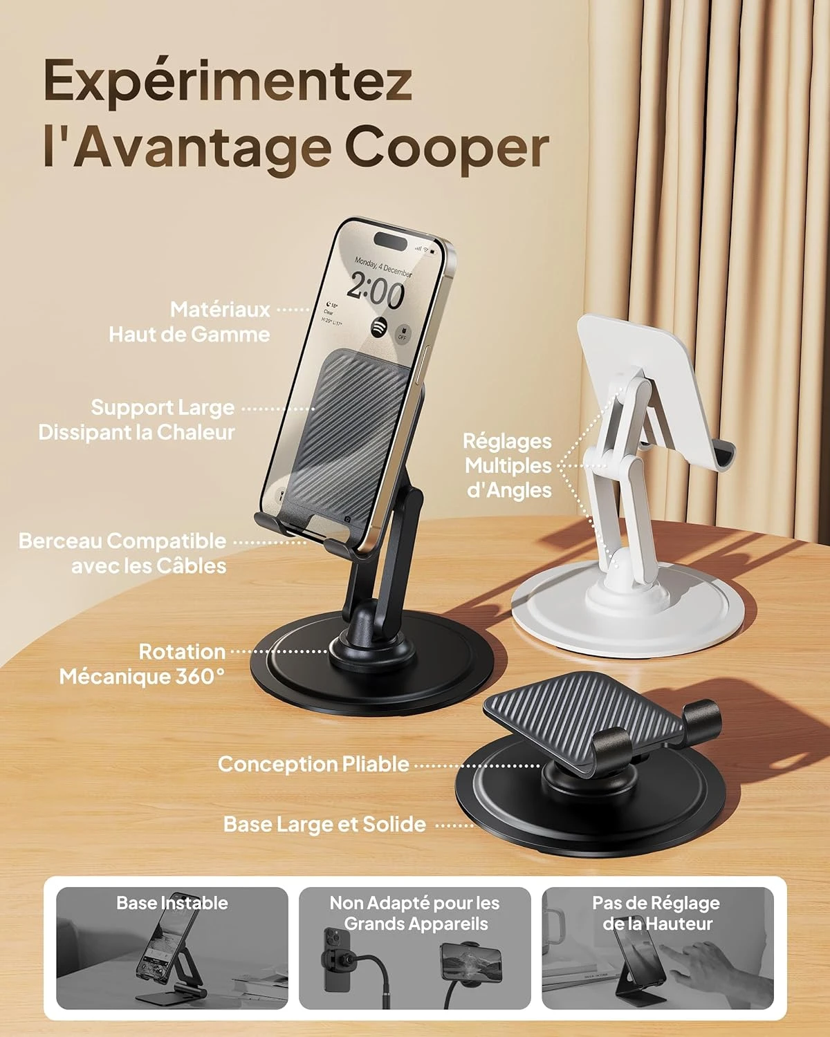Découvrez notre Support Smartphone Bureau Cooper 360°, votre compagnon de bureau parfait pour une expérience mains libres ultime avec votre téléphone, tablette ou autres gadgets technologiques. Que ce soit pour des appels vidéo, du streaming ou des jeux, notre support vous offre une solution pratique et ergonomique.