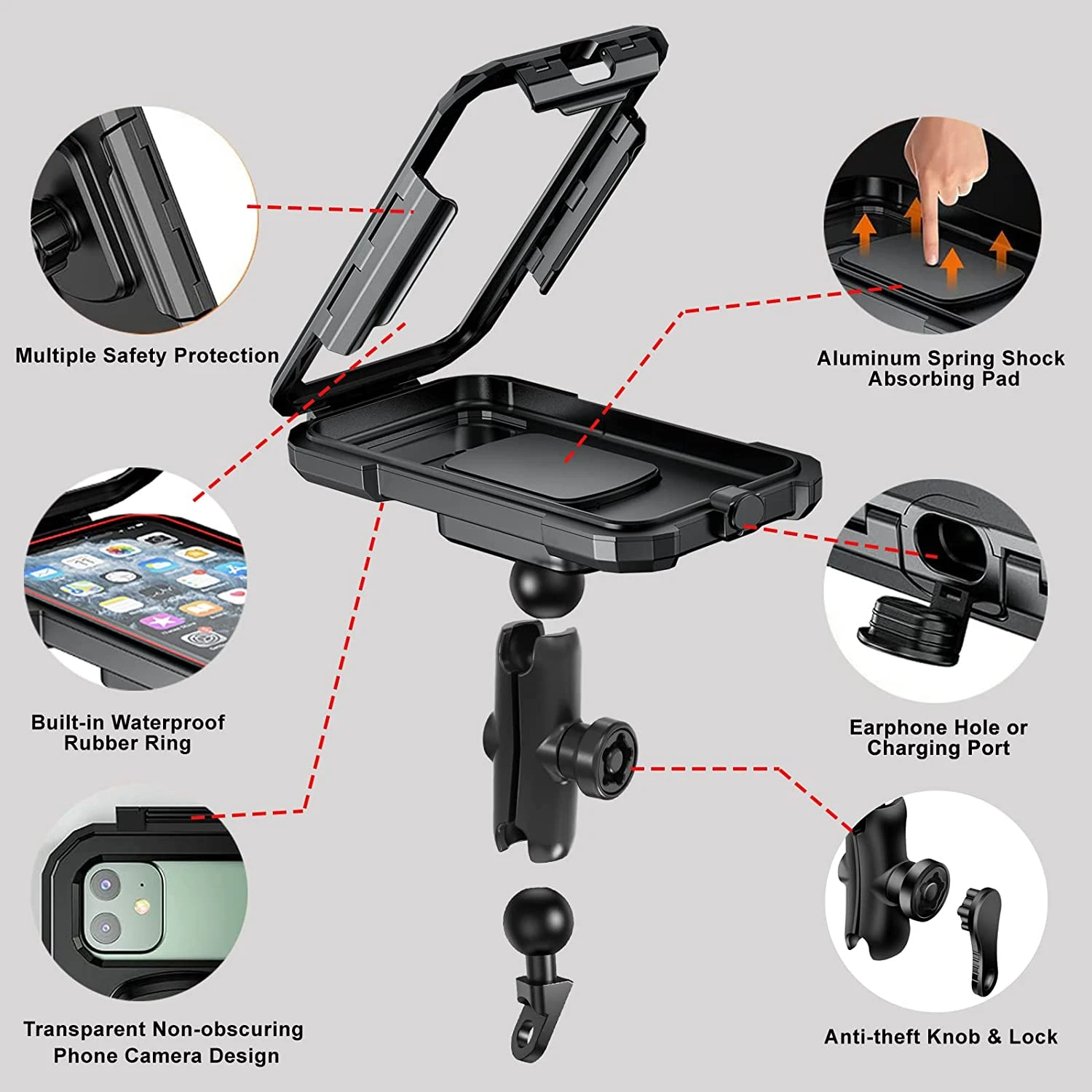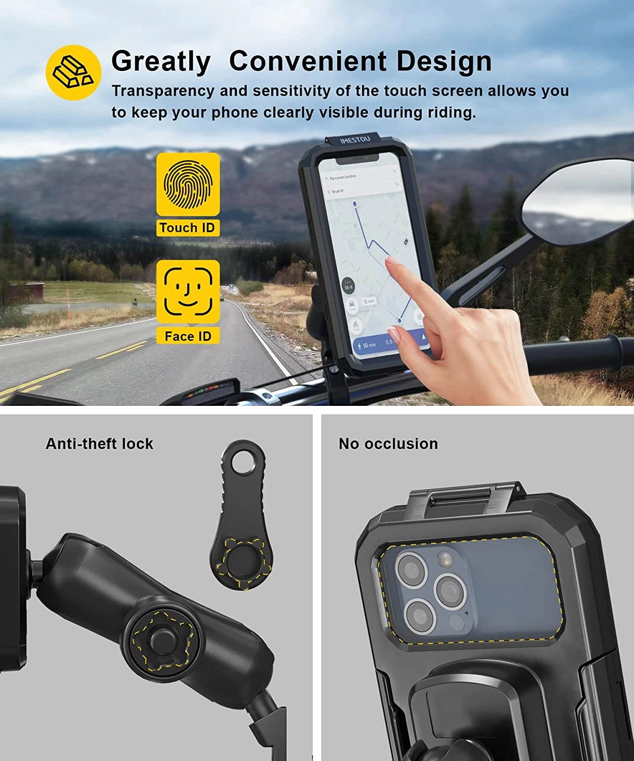 Notre Support pour smartphones à moto est conçu avec un bouton de verrouillage ultra sécurisé et est fourni avec une clé pour éviter que quelqu’un essaie de le voler lorsque vous laissez votre moto sans surveillances ❤️.