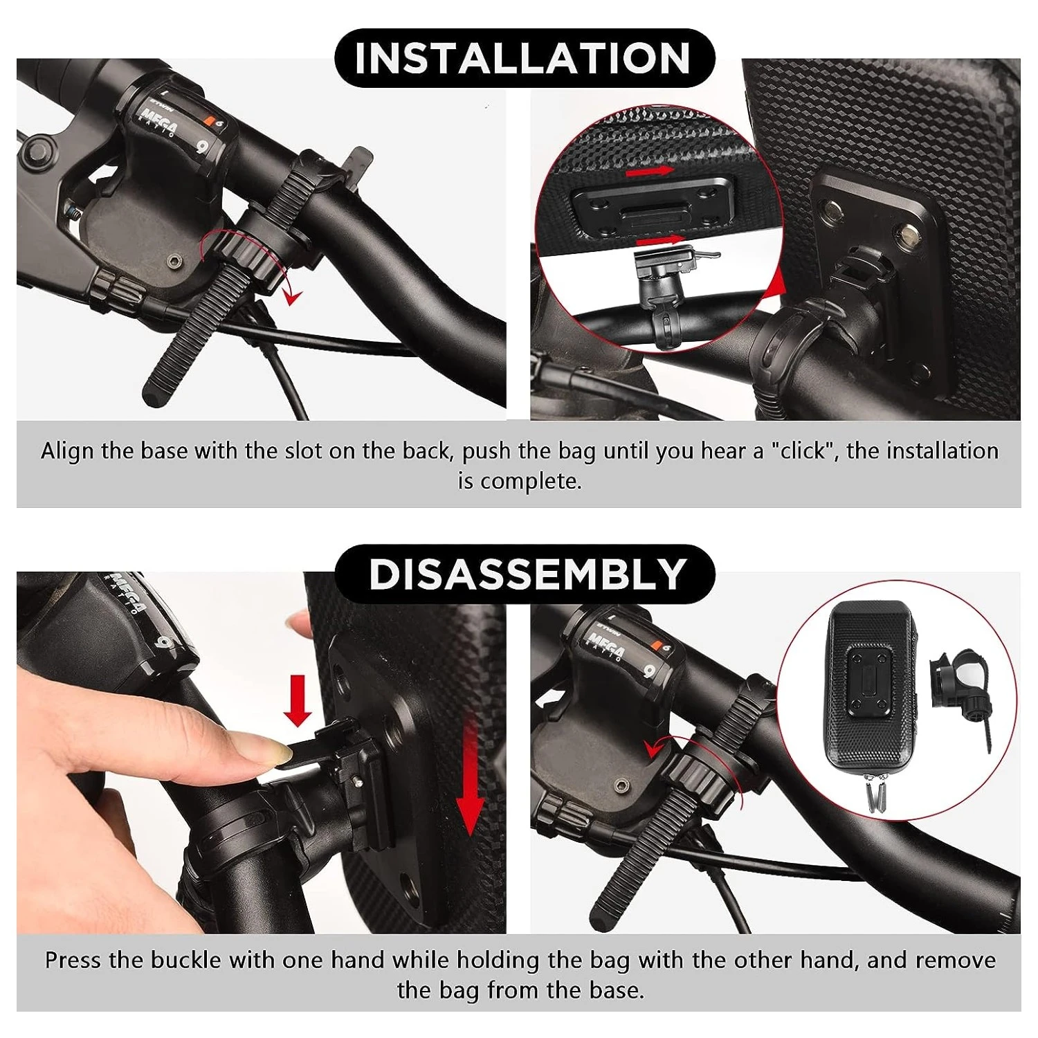 Rotation 360° et Nouveau Système de Fixation ✨ Profitez d’une vue panoramique avec la rotule pivotante à 360°, vous permettant de choisir l’angle de vue optimal pendant vos sorties à vélo. Notre sacoche de guidon vélo est équipée d’un nouveau système de fixation qui rend le montage et le démontage plus faciles que jamais. Adaptée à la plupart des vélos, cette sacoche convient au guidon de moins de 45 mm de diamètre.