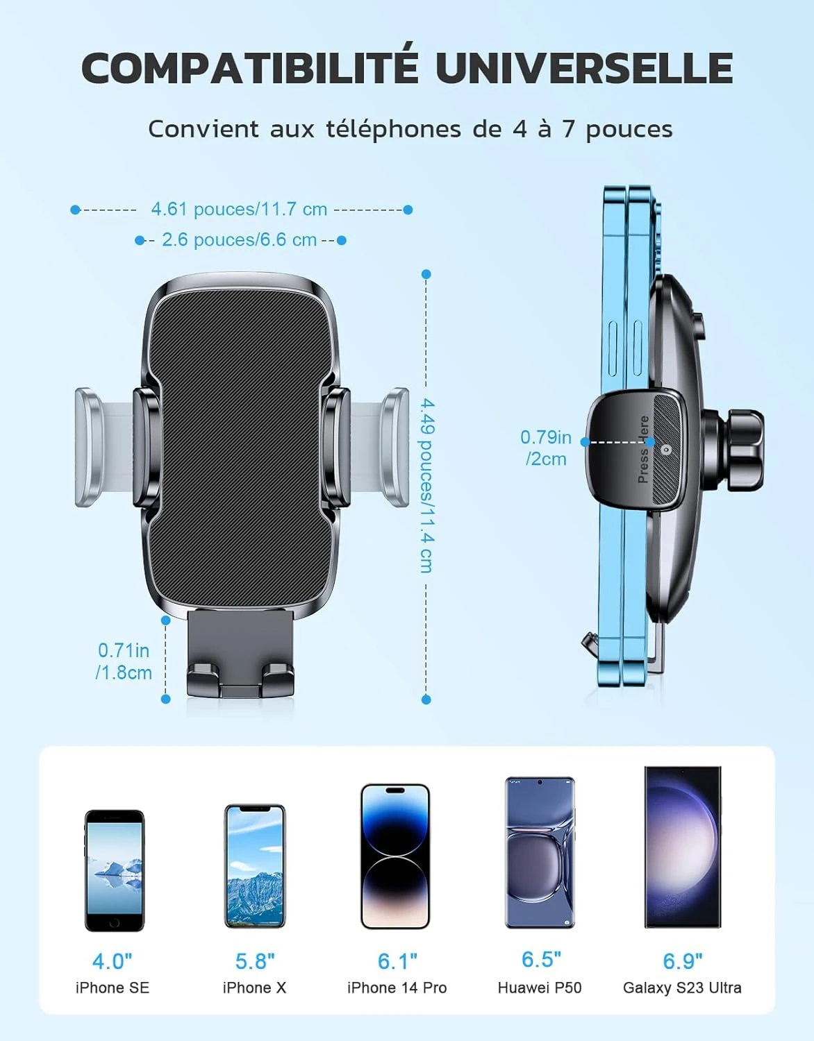 - Téléphones compatibles : 4″ à 7″